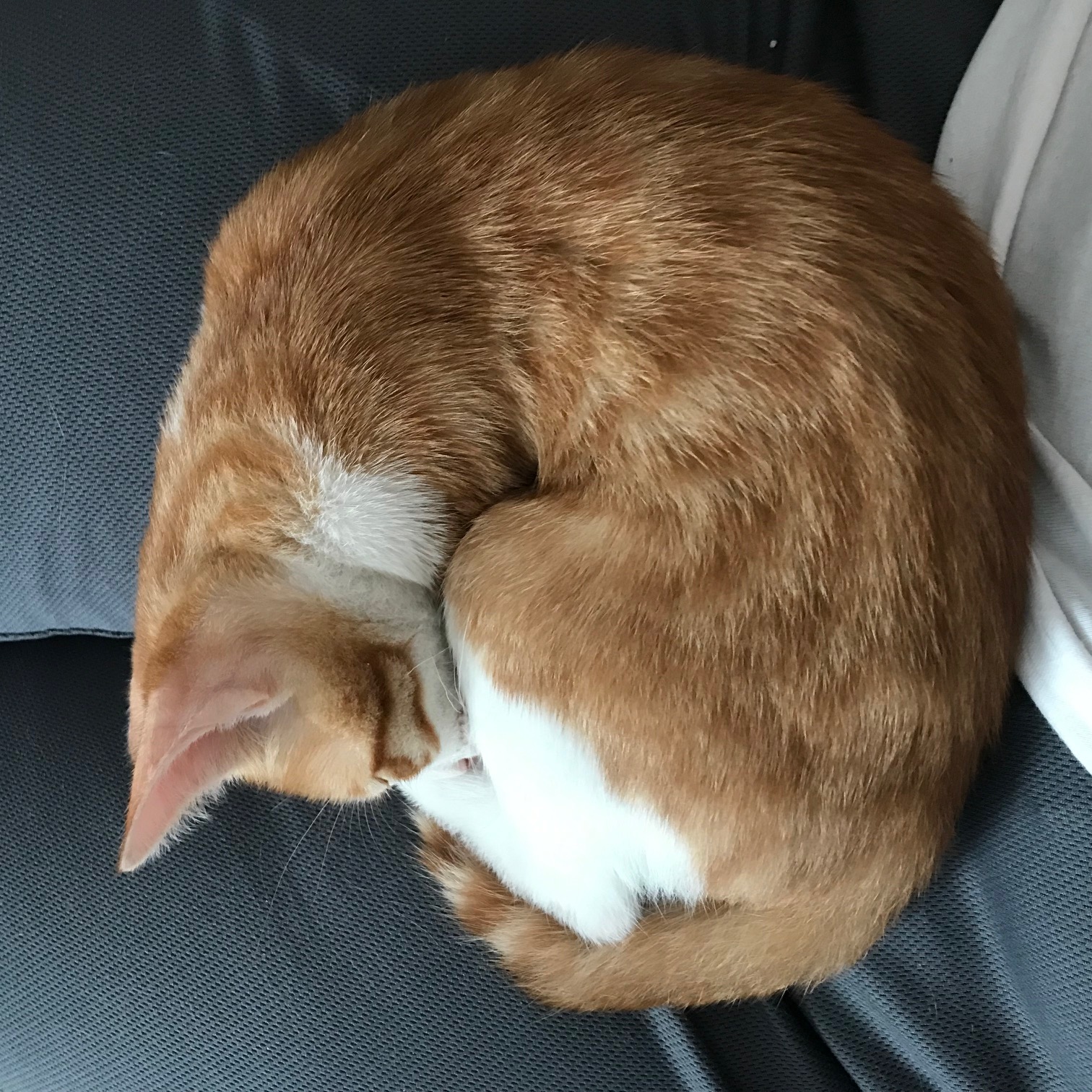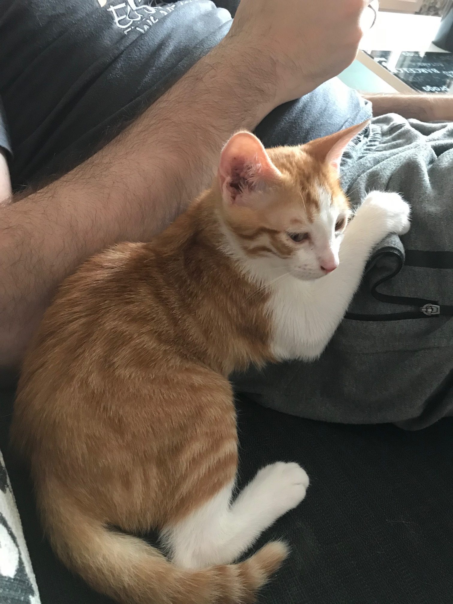Es uno de los gatos más mimosos que he tenido: le encanta tumbarse encima de nosotros o bien pegado y que le rasquemos la cabeza o la tripa (sí, se pone boca arriba para enseñarnos la tripa).