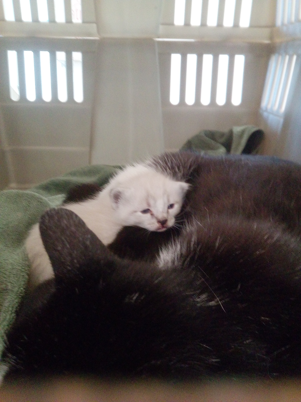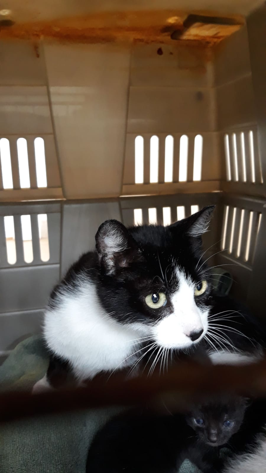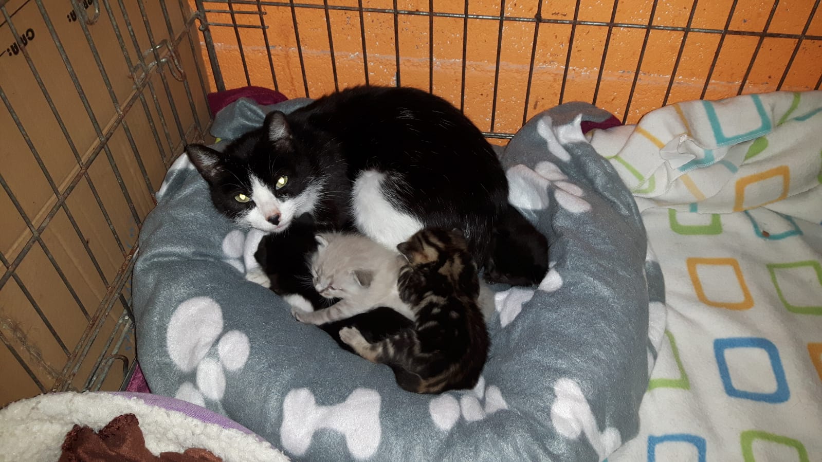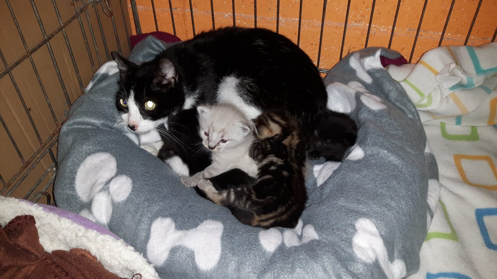Esta mañana han dejado a Hellen en la perrera con sus 5 cachorros de unas dos semanas aproximadamente. Es una gata a la que hemos podido acariciar aunque esta muy asustada