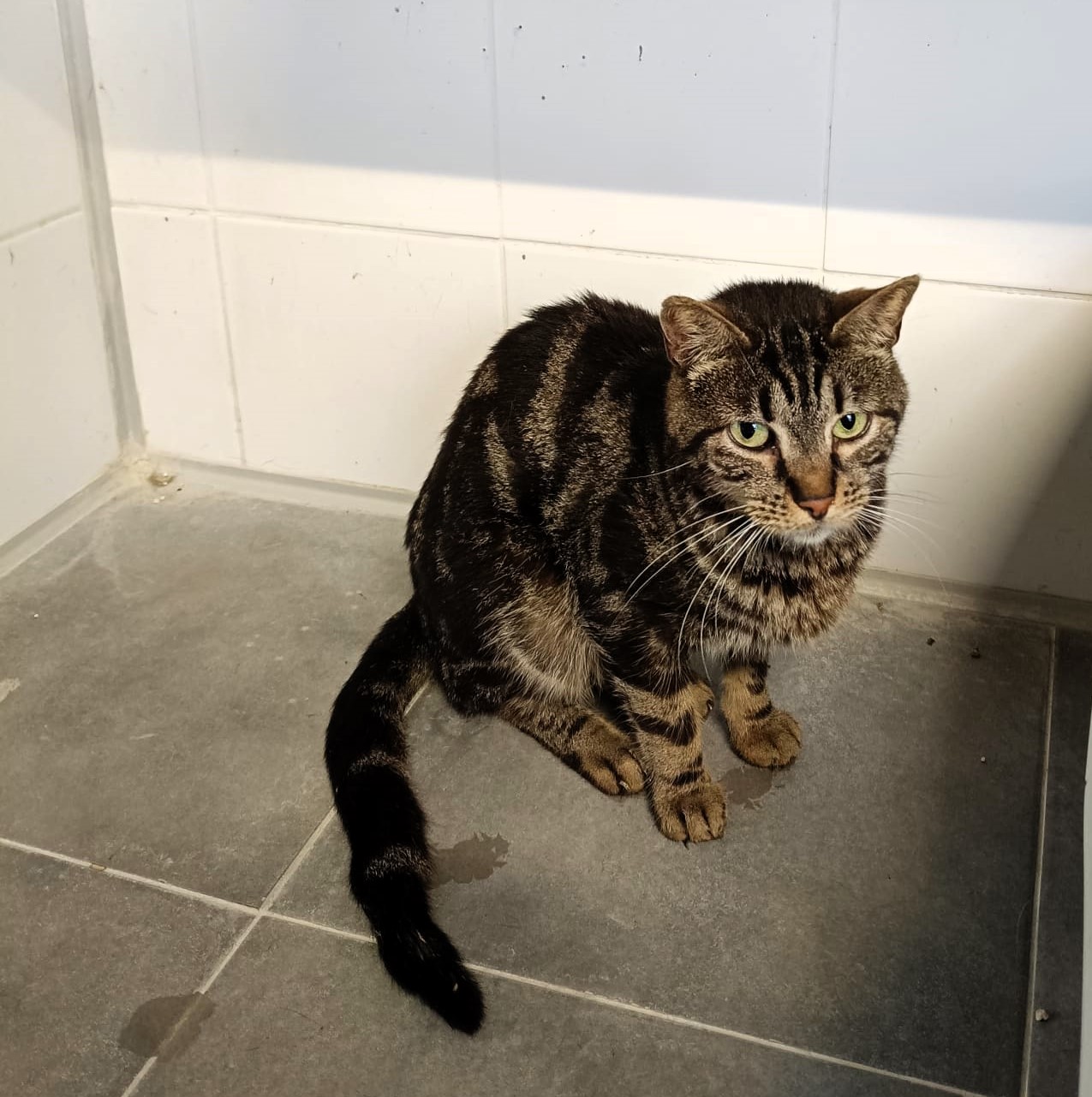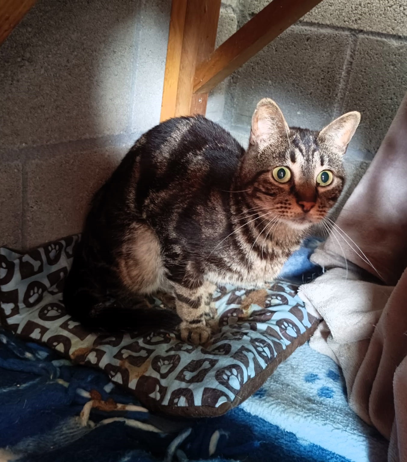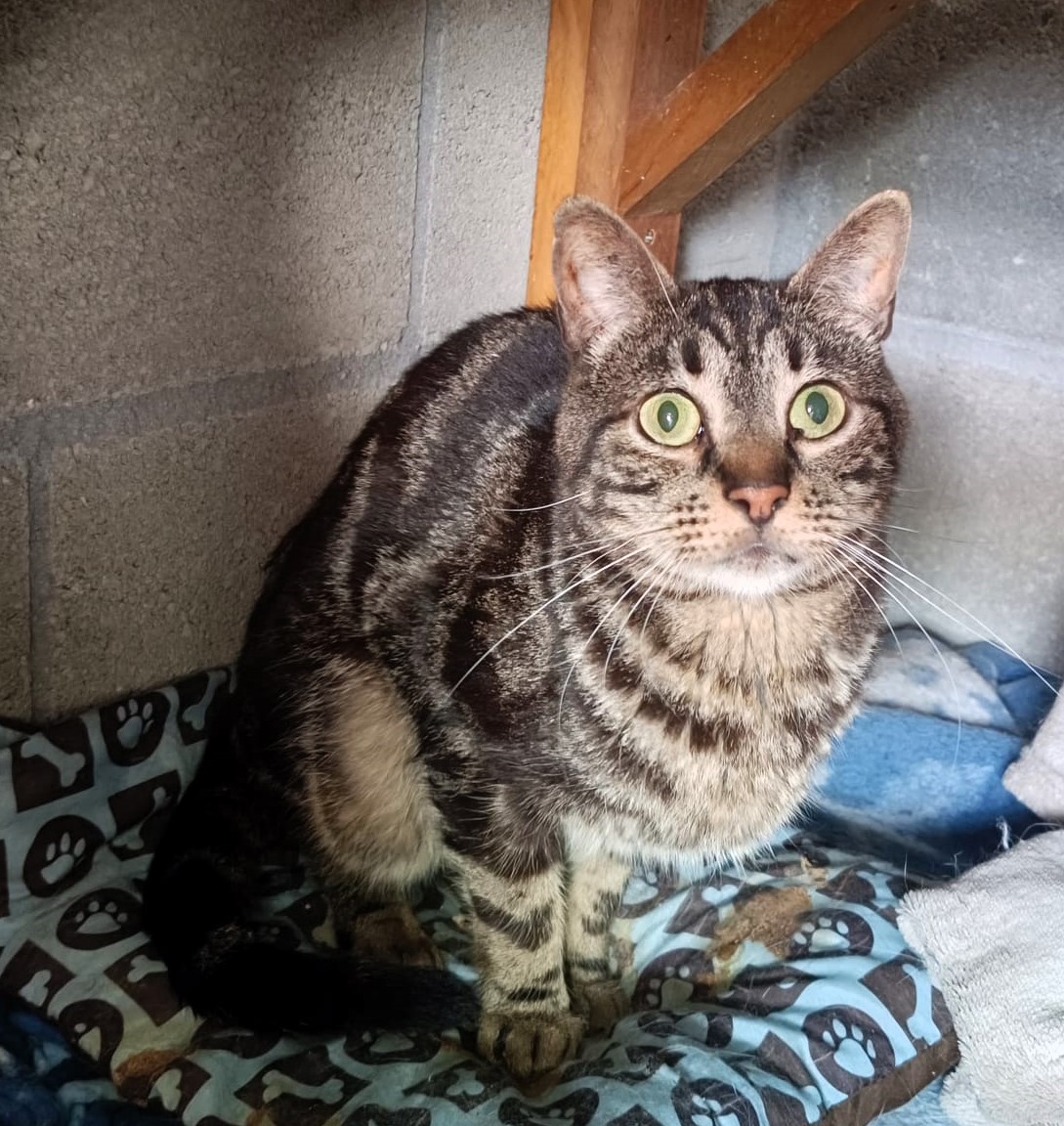 IPANEMA es una gata gris atigrada con un patrón de pelaje realmente especial, de esos que llaman la atención por su elegancia y originalidad. Nació en noviembre de 2019 y lleva en el centro desde agosto de 2021, lo que la convierte en la residente más veterana del refugio.