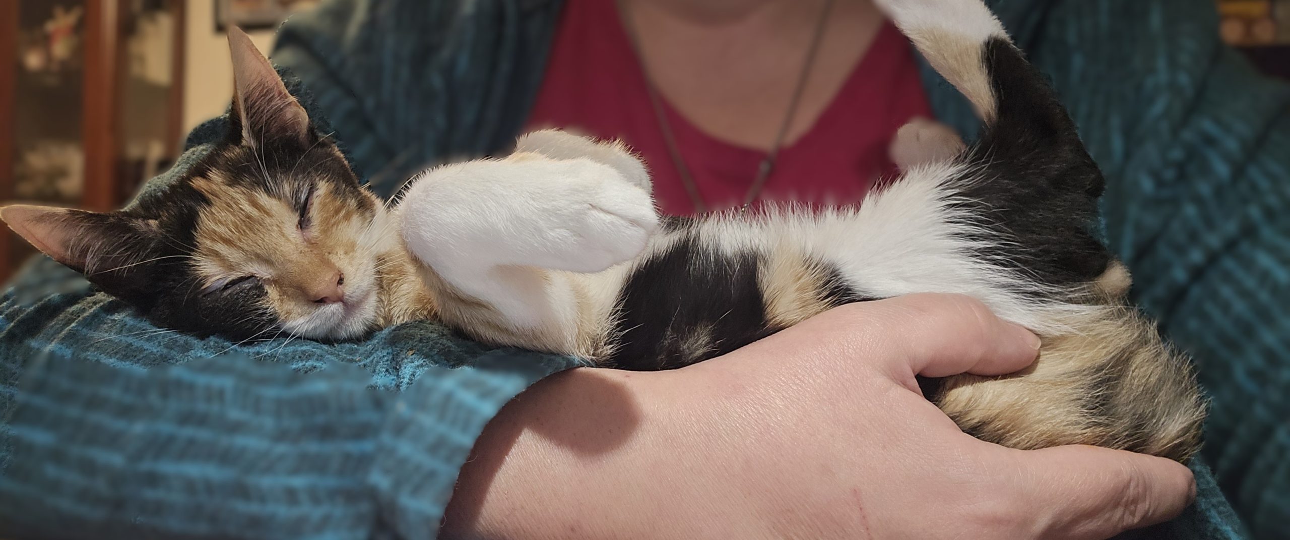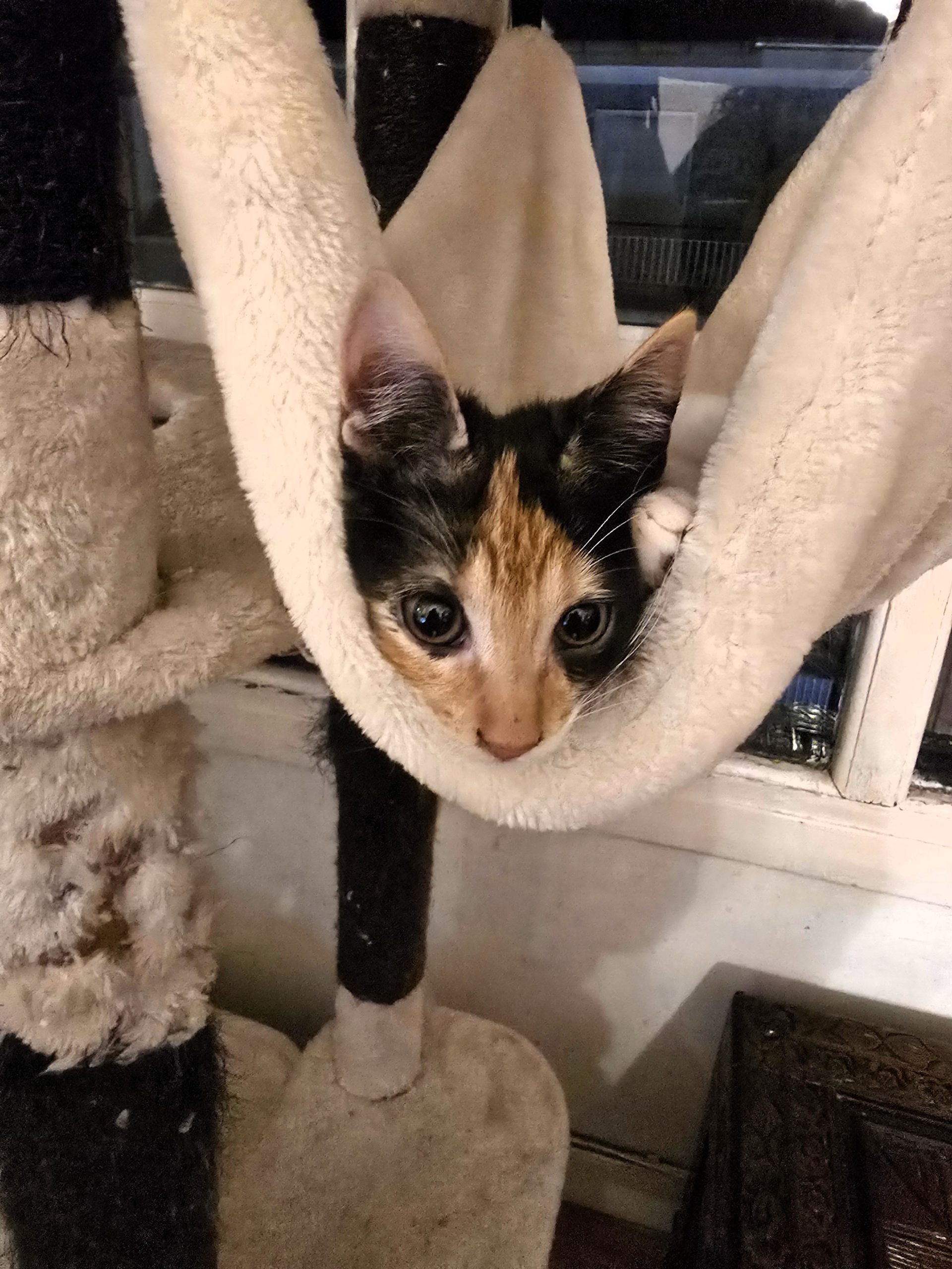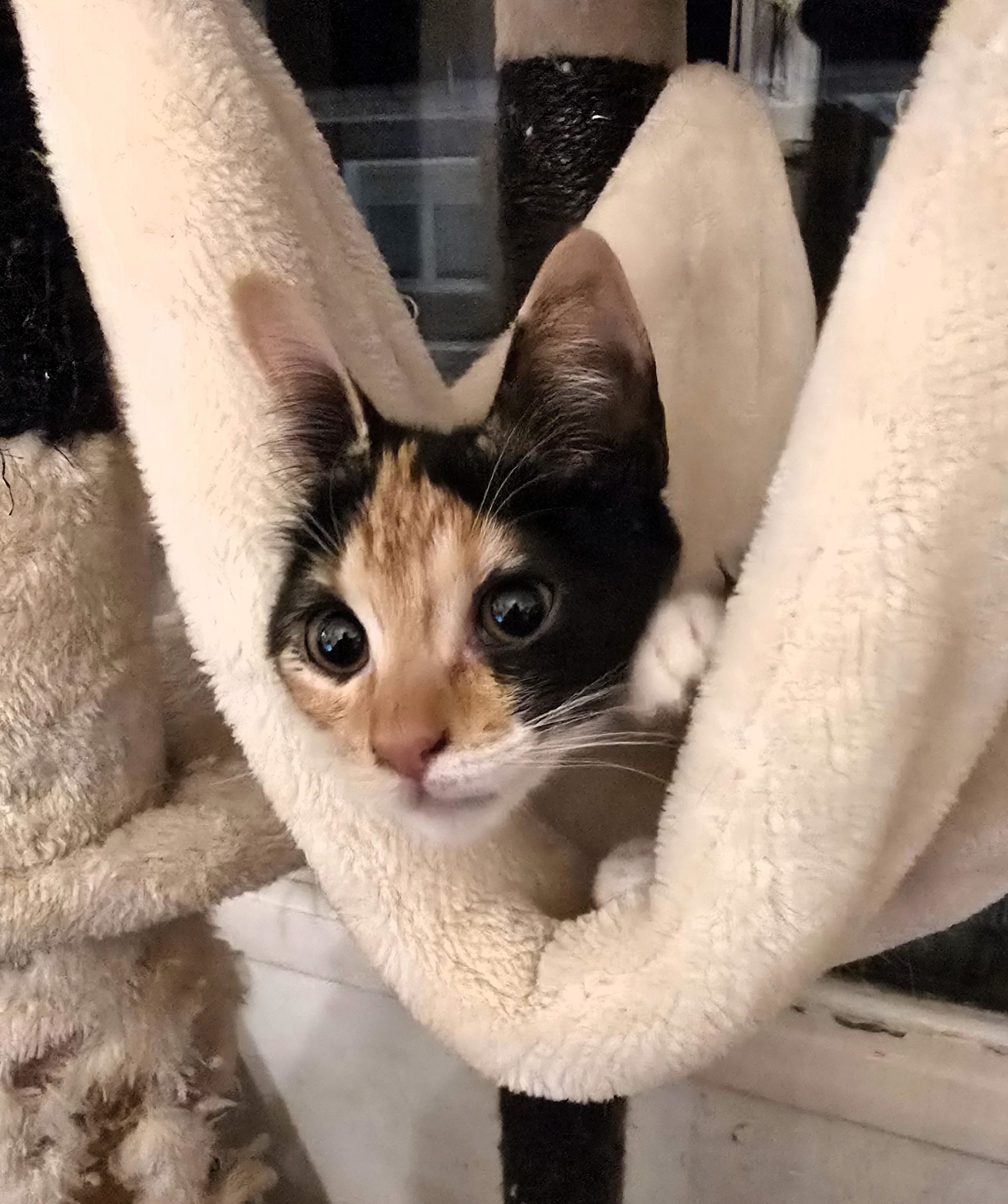 IXCHEL tiene actualmente cinco meses. Es una preciosa gatita tricolor que siempre con la cola muy erguida. Es muy juguetona y suele seguir a su mami de acogida y pedirle atención. Se lleva bien con perros  y gatos.