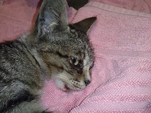 Josepo tendrá aproximadamente 3 meses y ya sabe lo que es sufrir… por el momento se muestra muy asustadizo, claro que seguro que el dolor no ayuda.