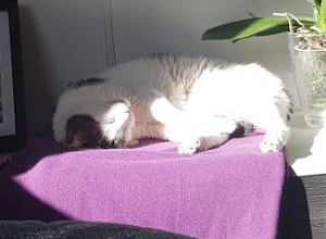 es un gato muy tranquilo que jamás ha arañado a nadie, extremadamente cariñoso y muy glotón. Alguna vez por la noche le da por jugar y corretear pero normalmente es quietito. Si esta sólo duerme o toma el sol, pero en cuanto hay gente en casa, va en su búsqueda para pedir mimos. Es buenísimo