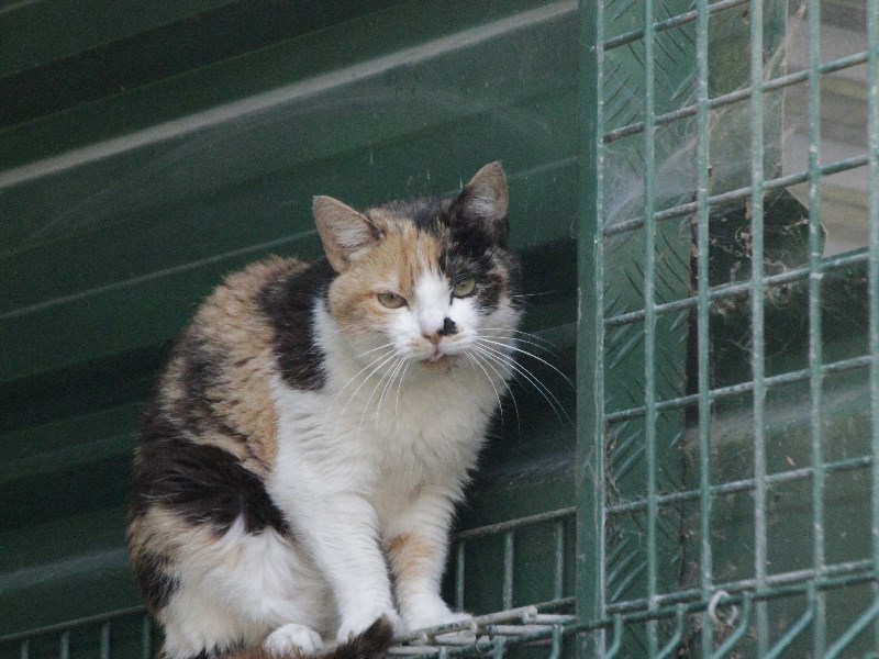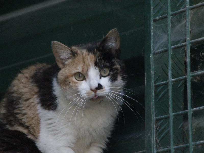 Justi fue esterilizada y testada. Desafortunadamente, es positiva en leucemia felina, lo cual siempre reduce las oportunidades de que alguien se fije en ella. Vive en la perrera con César y Marlon sin ningún problema. Cuándo alguna de nuestras compañeras accede a los recintos, ella sube a las alturas, sólo baja cuñando ve que hay latita, entonces se anima.