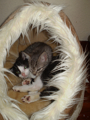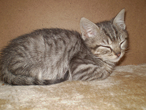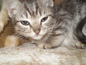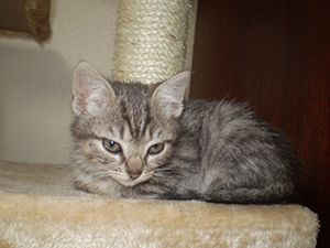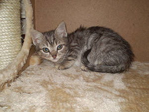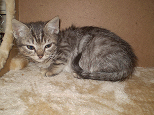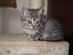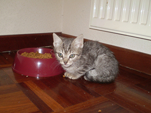Kike es un gatín que fue recogido de debajo de un coche, con dos garrapatas mas grandes que él… Es un poco asustadizo en el primer momento, pero luego le coges en brazos y ronronea, así que unas dosis de mimos arreglarán su timidez.