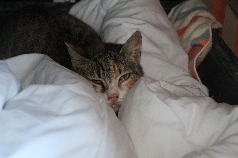Kimberly ha adelgazado; no come bien últimamente debido al mal estado de su boca. Tras una revisión el veterinario ha determinado que hay que extraerle los colmillos. Esperamos que así los dolores que sufre desaparezcan y pueda sentirse un poco mas cómoda. Es una gata muy buena, toda una reinona; de las que no te hacen mucho caso pero que se tumban cuando intuyen que llega la ración de mimos.