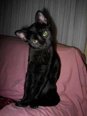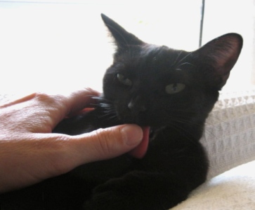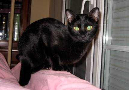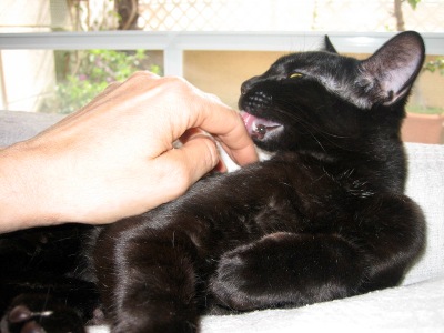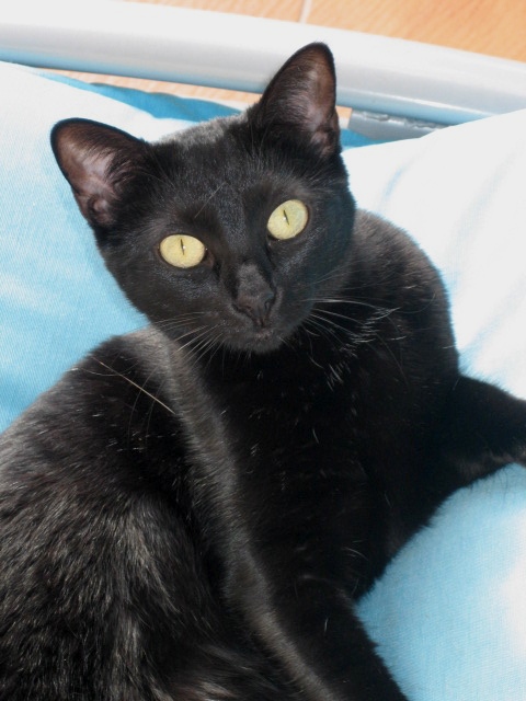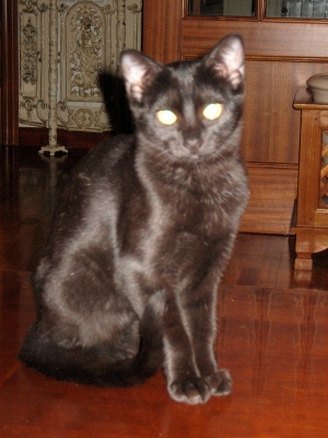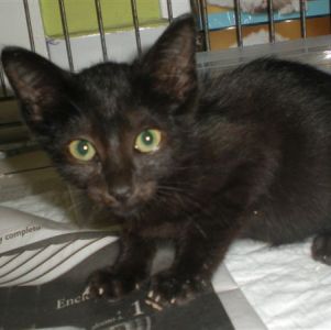 Lola tiene aprox. 5 meses. Es tranquila, pero bastante huidiza, aunque ha hecho muchos progresos . Estoy segura de que con el tiempo será una gata sociable y confiada. La muy brujilla duerme en la cama de su casa de acogida y cuando estira la mano le muerde los dedos, pero no quiere que la cojan.