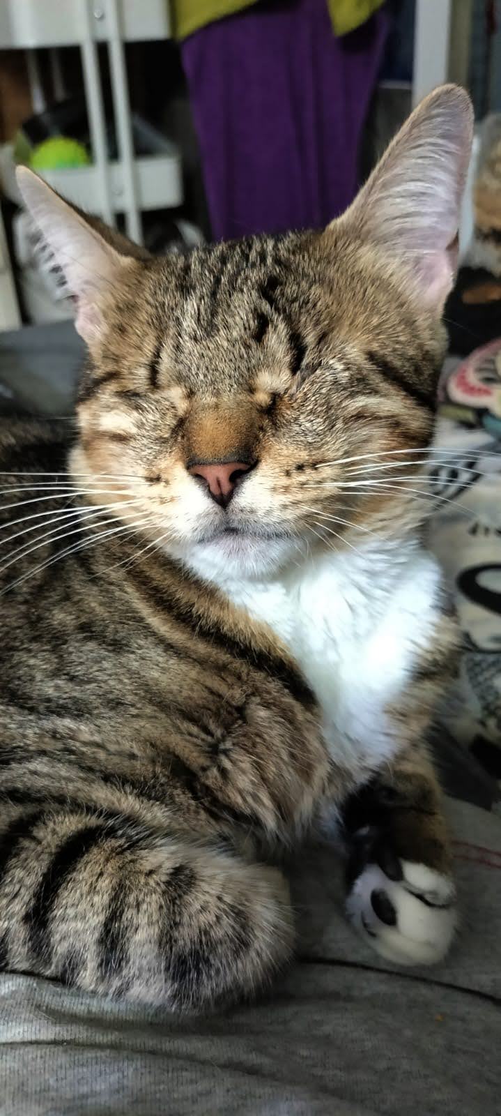Lucia: hembra atigrada ciega de buen carácter, convive con 2 perros pequeños. A la pequeña Lucia la apodamos»la tirita» pq está pegada al humano que tercia y se le acerque a hacer mimos, sumamente cariñosa, en 2 minutos la tienes amasando y ronroneando.