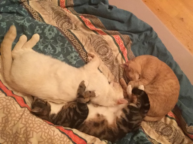 M.A. fue adoptado hace muchos años, pero seguimos recibiendo buenas noticias sobre él. Nos manda recuerdos desde su hogar con su gran familia gatuna. Gracias por quererle tan bien.