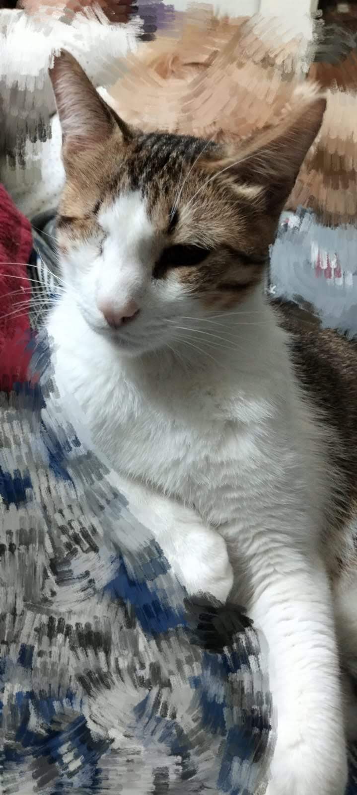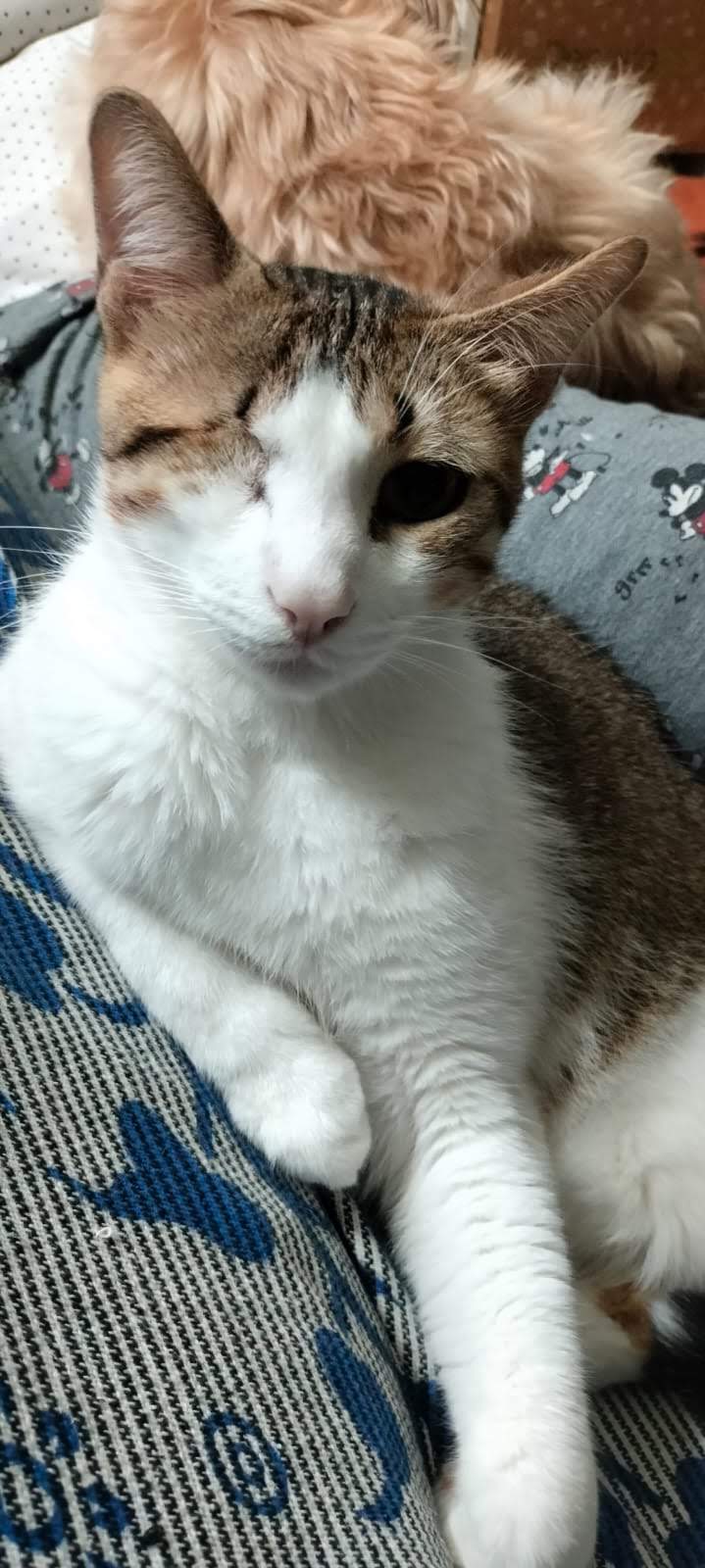 Lucia: hembra atigrada ciega de buen carácter, convive con 2 perros pequeños. A la pequeña Lucia la apodamos»la tirita» pq está pegada al humano que tercia y se le acerque a hacer mimos, sumamente cariñosa, en 2 minutos la tienes amasando y ronroneando.