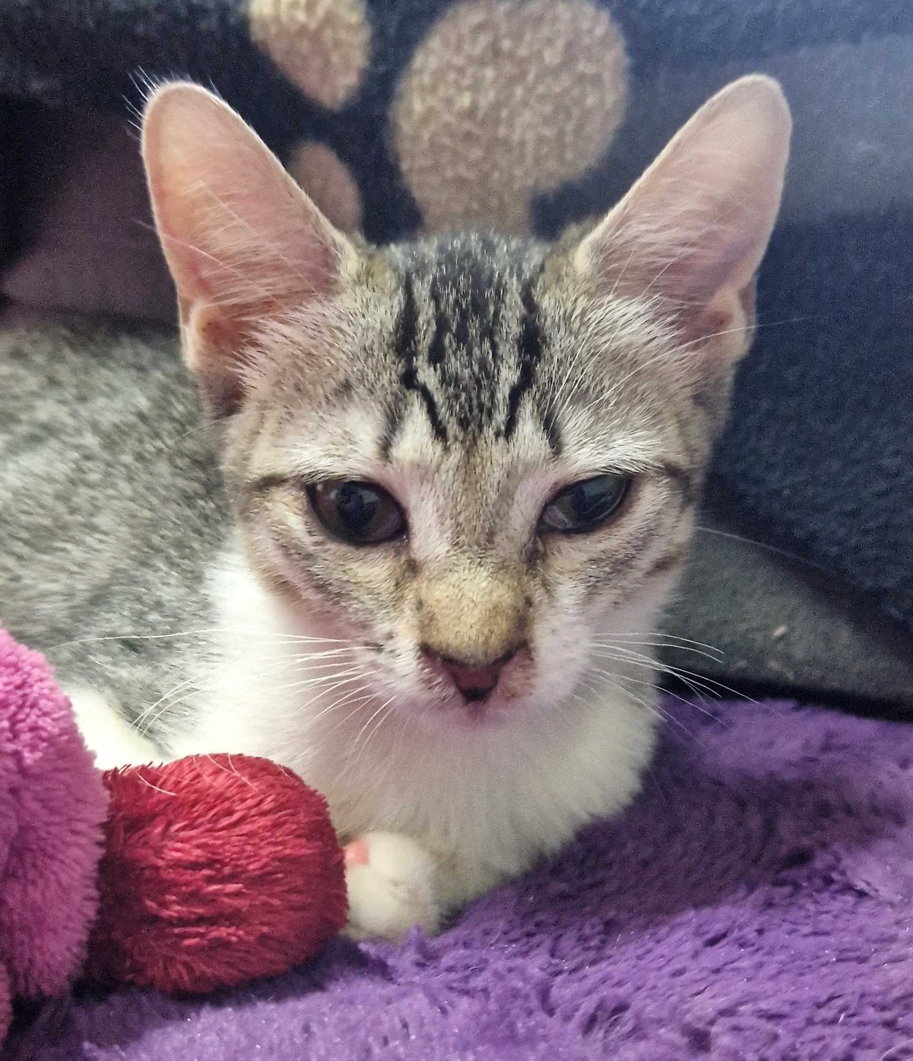 MAITREYA fue encontrada junto con su hermanita en una caja bajo la fría lluvia con sólo 10 días. Ambas fueron trasladadas a una casa de acogida donde se les aseó y se le dio calorcito y se inicio la desparasitación externa. Actualmente tienen unos 3 meses y buscan un hogar donde ser felices.