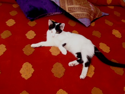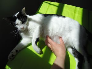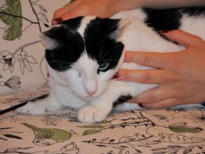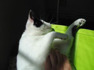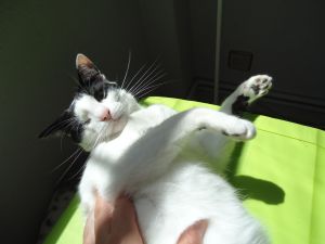 Es una gata muy mimosa,aunque algo tímida al principio, en cuanto nos ve, se tumba en el suelo para que le rasquemos la tripilla.