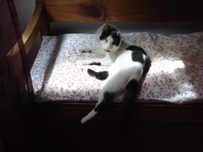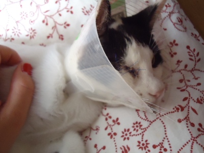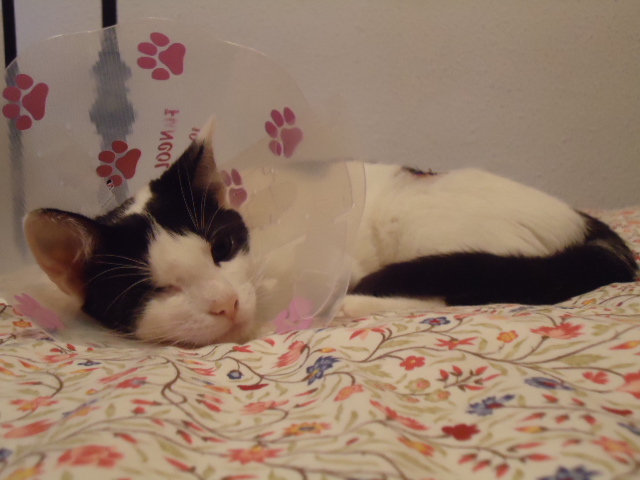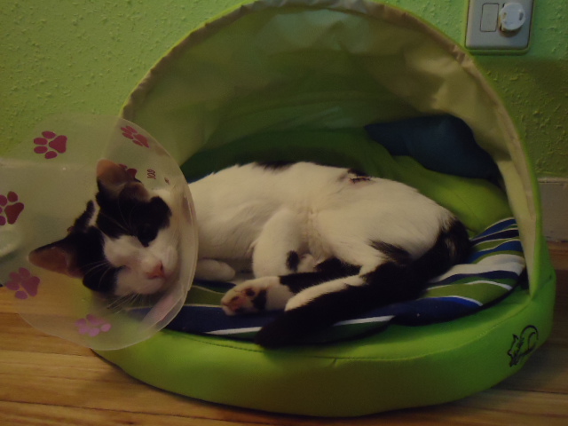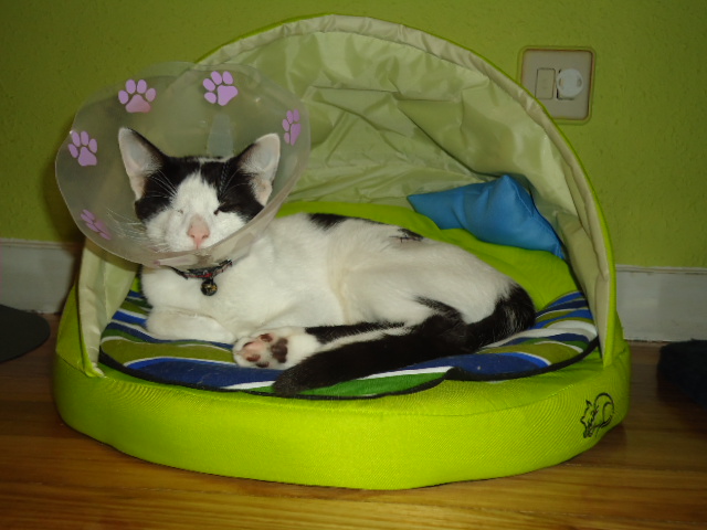 Margot ha sido esterilizada. Después de lo del ojo, no le hace ni pizca de gracia volver a tener que llevar el collar isabelino, pero aguanta todo como una campeona. No deja de ronronear ni en el veterinario…