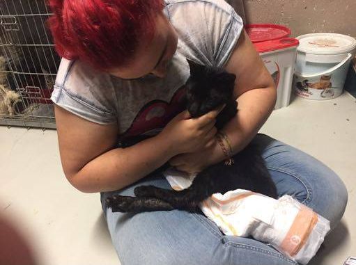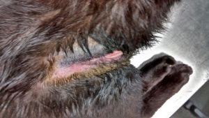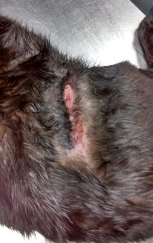 A todo esto, nos enteramos de que al peque no le habían hecho NI UNA PRUEBA, todo lo que nos habían dicho era MENTIRA. Además…el pañal que traía puesto era demasiado pequeño, demasiado apretado, demasiado tiempo puesto con toda la humedad y la porquería, pegado con CINTA DE CARROCERO METALIZADA, hubo que cortar con tijeras el pañal que estaba a rebosar, todo el pelo sucio y apelmazado…y unas heridas TERRIBLES en la articulacion de la pata a la ingle.