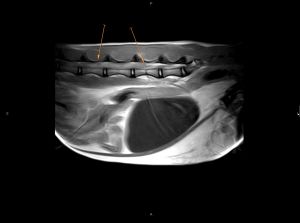 El resultado de la resonancia no podía ser peor: «Mielomalacia degenerativa que abarca desde sector L4 hasta L7 con mayor incidencia en L5» es decir, por lo que nos explicó el vete telefónicamente Maurice tiene una lesión muy grande en la médula ya que abarca 3/4 partes del grosor de la misma, los discos intervertebrales están bien. Lo siguiente que nos preguntó es si todavía andaba y fue el primer sorprendido al decirle que sí.