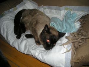 Ayer pasó por el vete para la puesta a punto: se le ha bañado, pelado medio lomo para quitar nudos, hecho analítica y puesto tratamiento. Parece que hay alguna infección pero todavía no sabemos dónde. Por lo demás, ella come, bebe y hace sus cosas perfectamente… eso sí, está ciega totalmente y para mi sorpresa, sorda como una tapia.