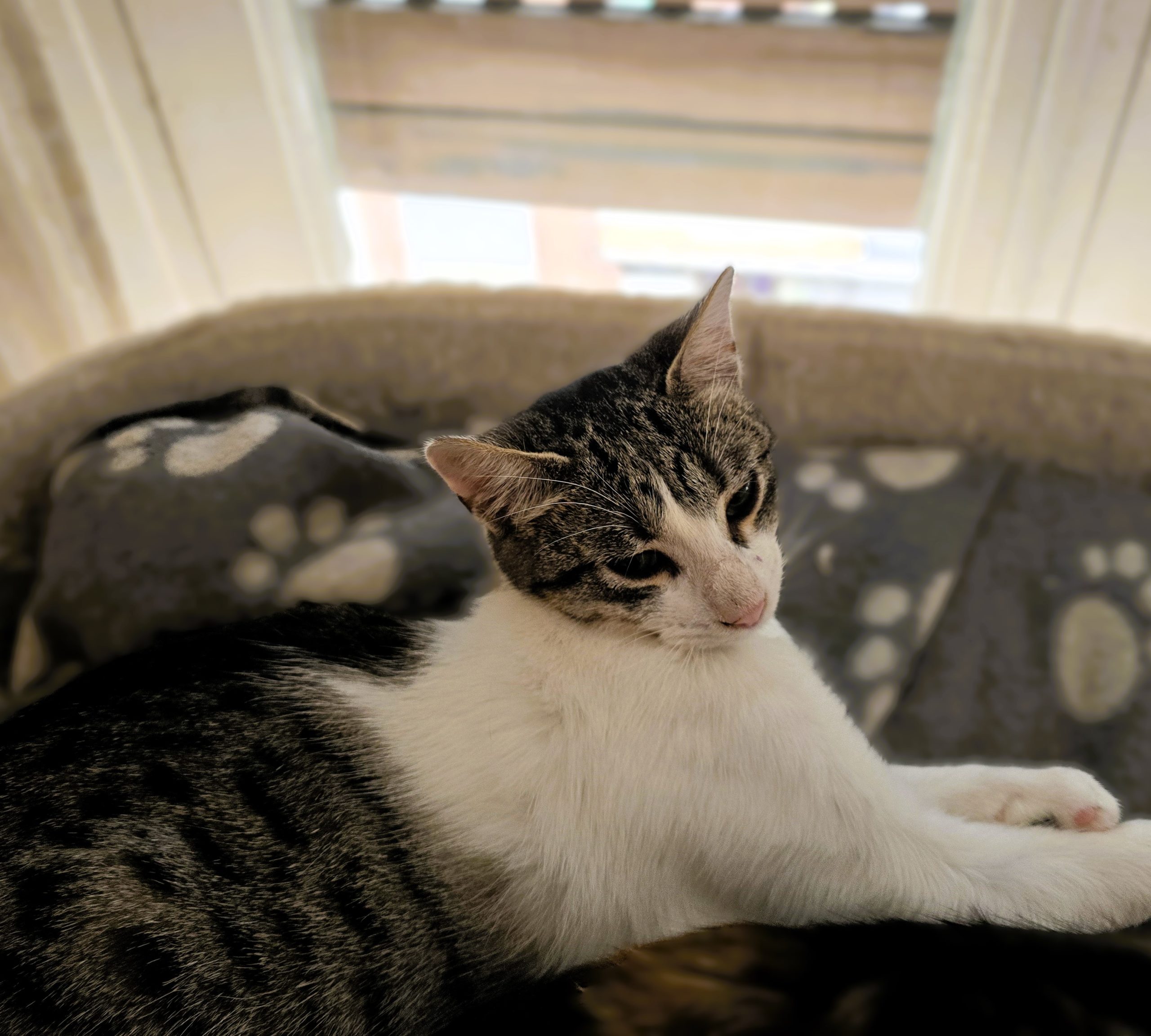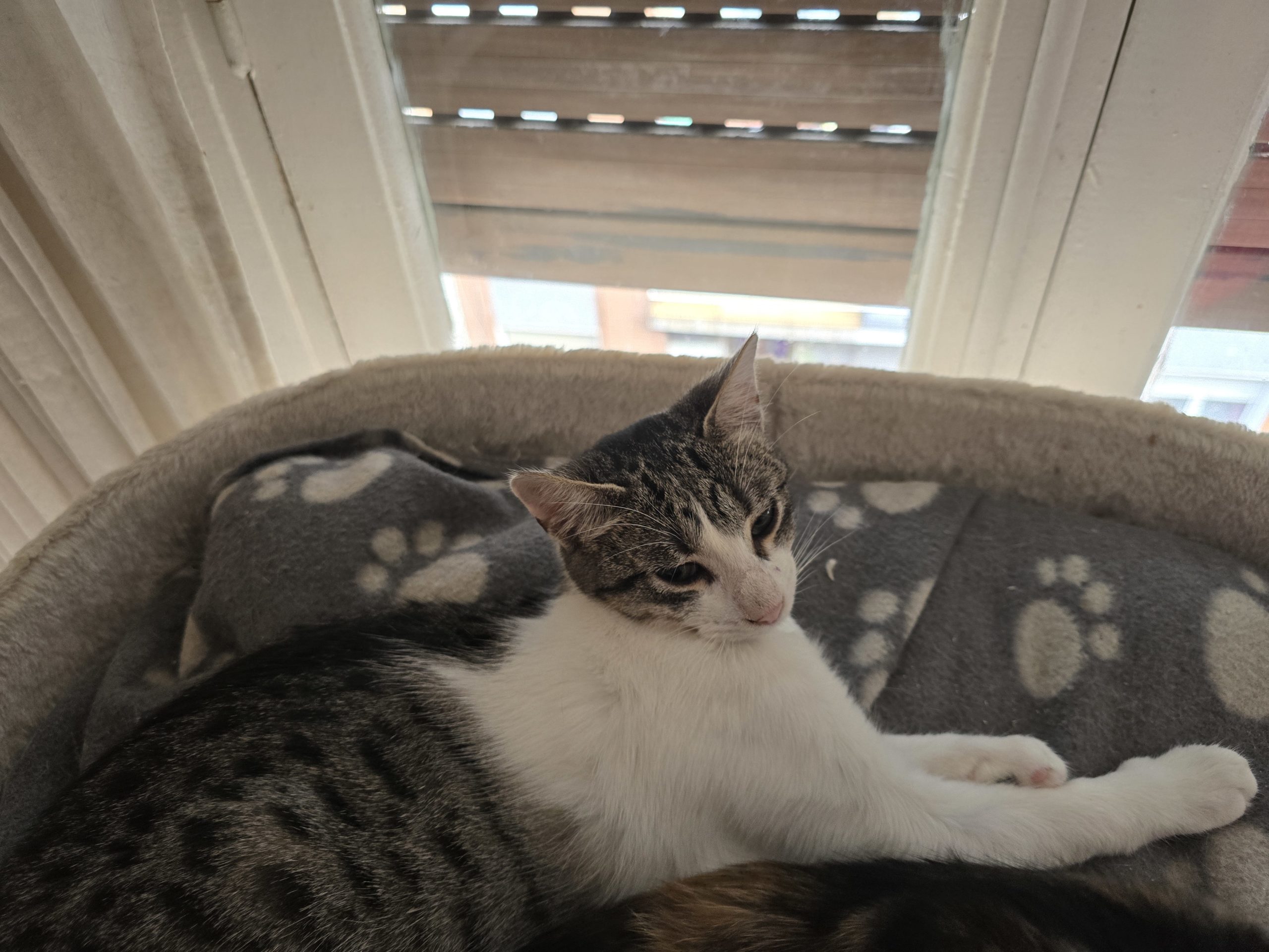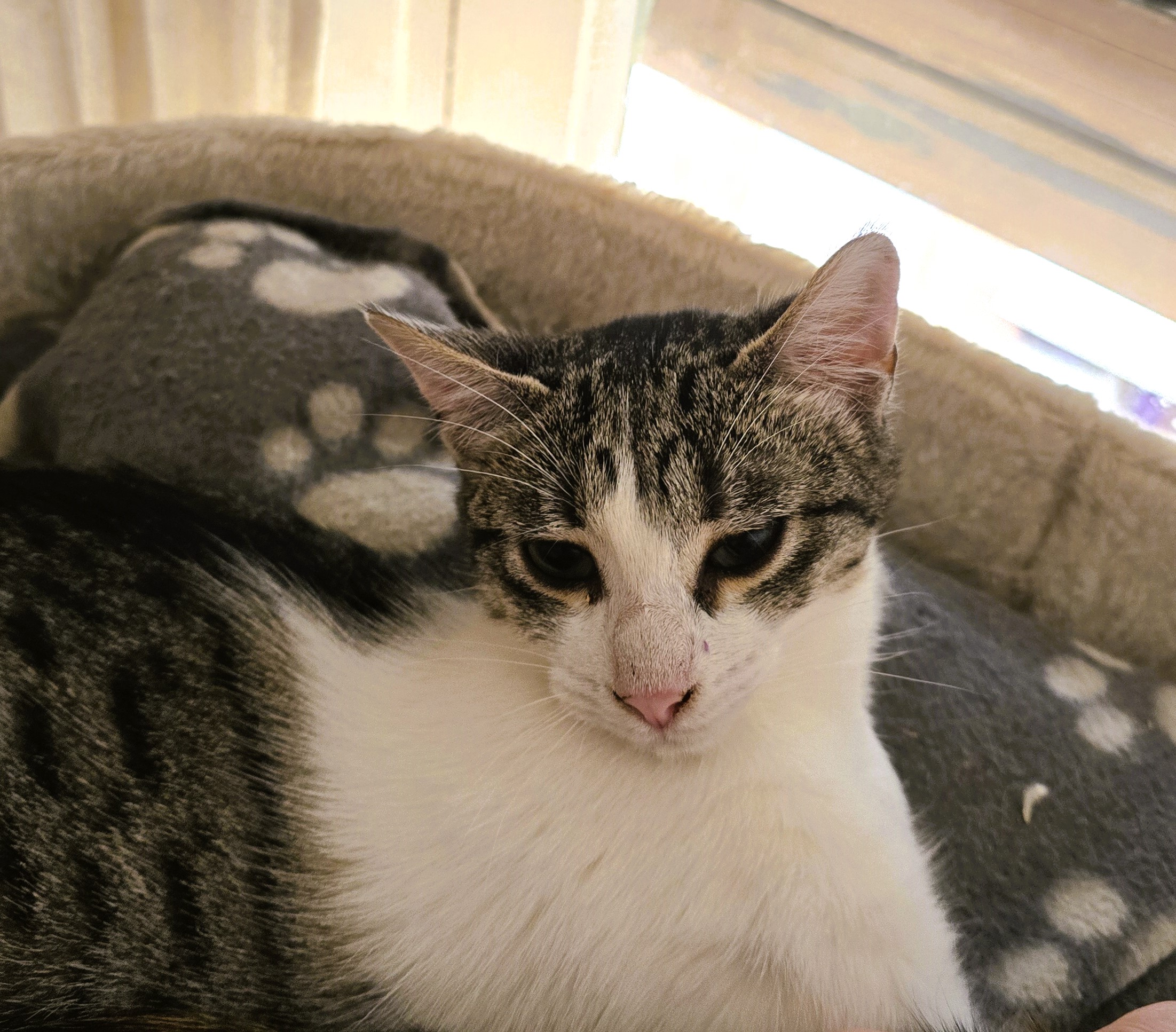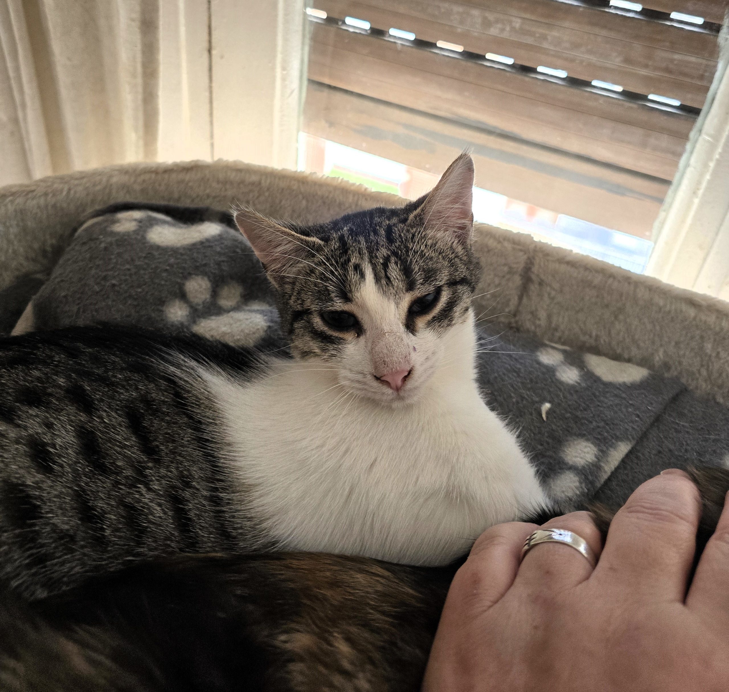 NIGERIA llegó a la casa de acogida a finales de agosto de 2025, con un aproximadamente 1 mes de edad. Ella es una gata juguetona y muy animada, es fácil de tratar, le gustan las caricias, se lleva bien con otros gatos y con su hermano NIGER. Los dos hermanos físicamente son muy parecidos lo único que les diferencia es el dibujo que le hace en la cabeza que es como una V invertida.
