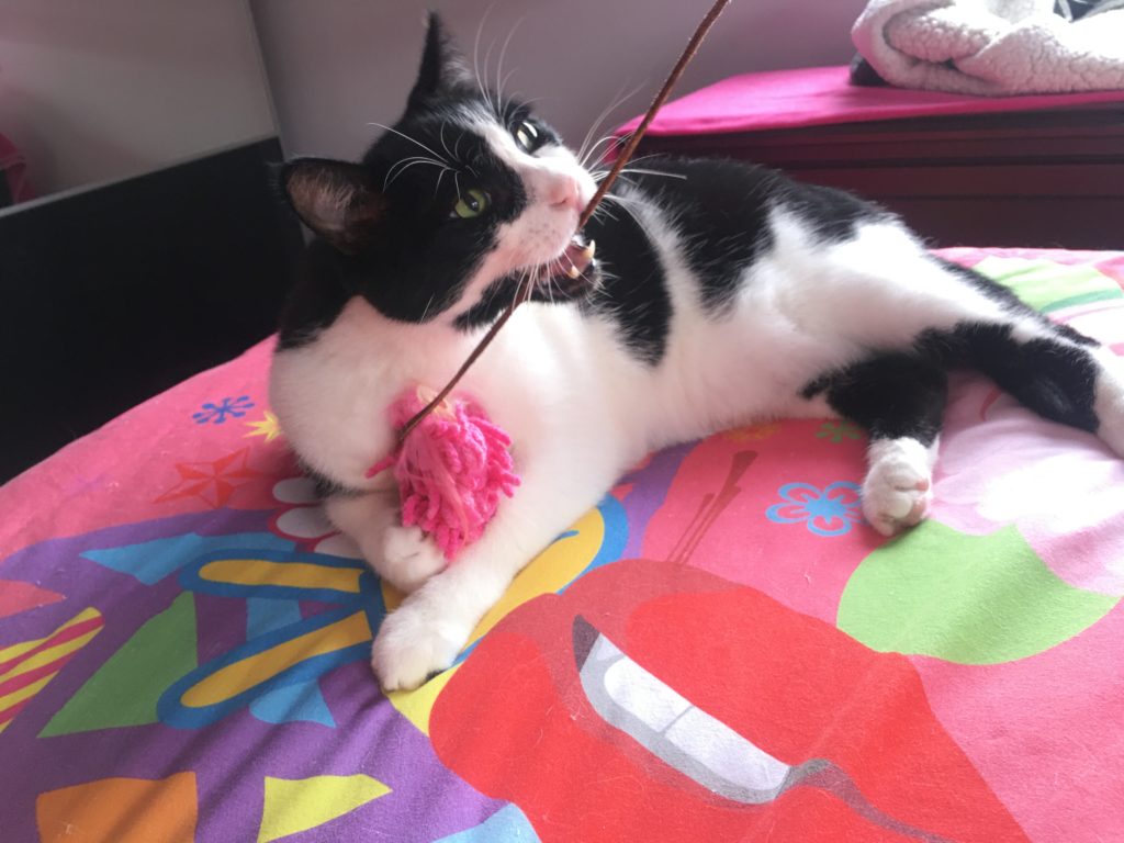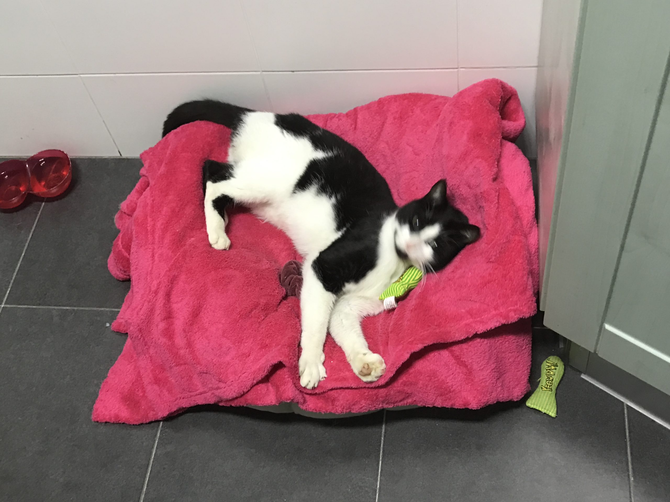 Al final la mancha que tenia en el ojo derecho Nikito resulto ser una masa y tuvo que ser intervenido para extirpar el globo ocular. Como veis, esto no le impide hacer vida normal y ser un gato feliz.