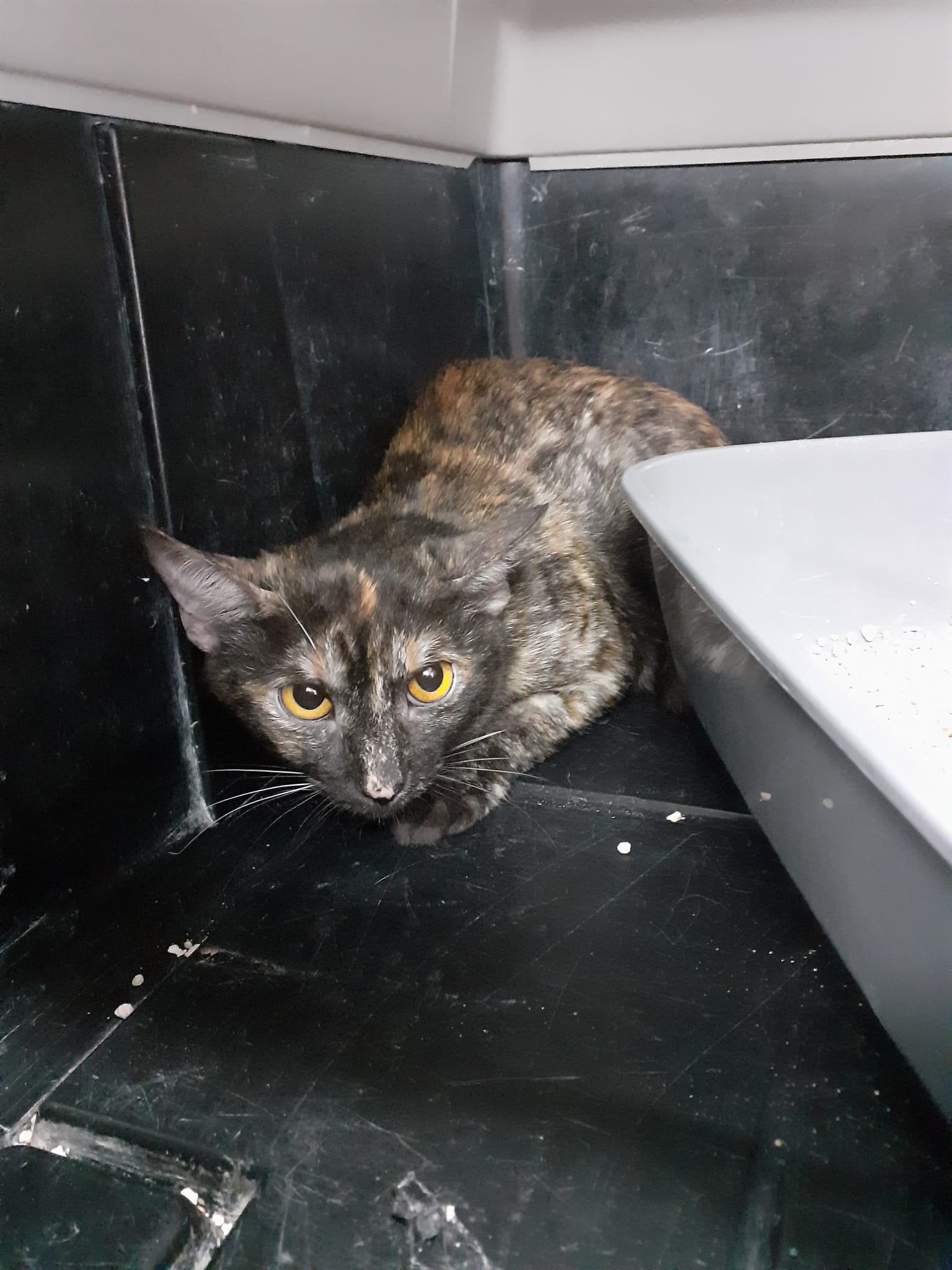 Tenemos la sospecha de que es una gata casera, y confiamos en que si se le da el tiempo que necesita para conseguir superar el susto que tiene, veremos a una gata buena.