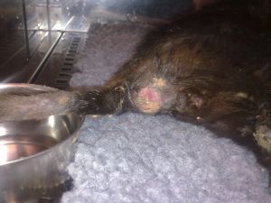 Un compañero lo ha recogido hoy en la calle en el estado que veis, con un palmo de intestino fuera y llenito de garrapatas, pulgas…