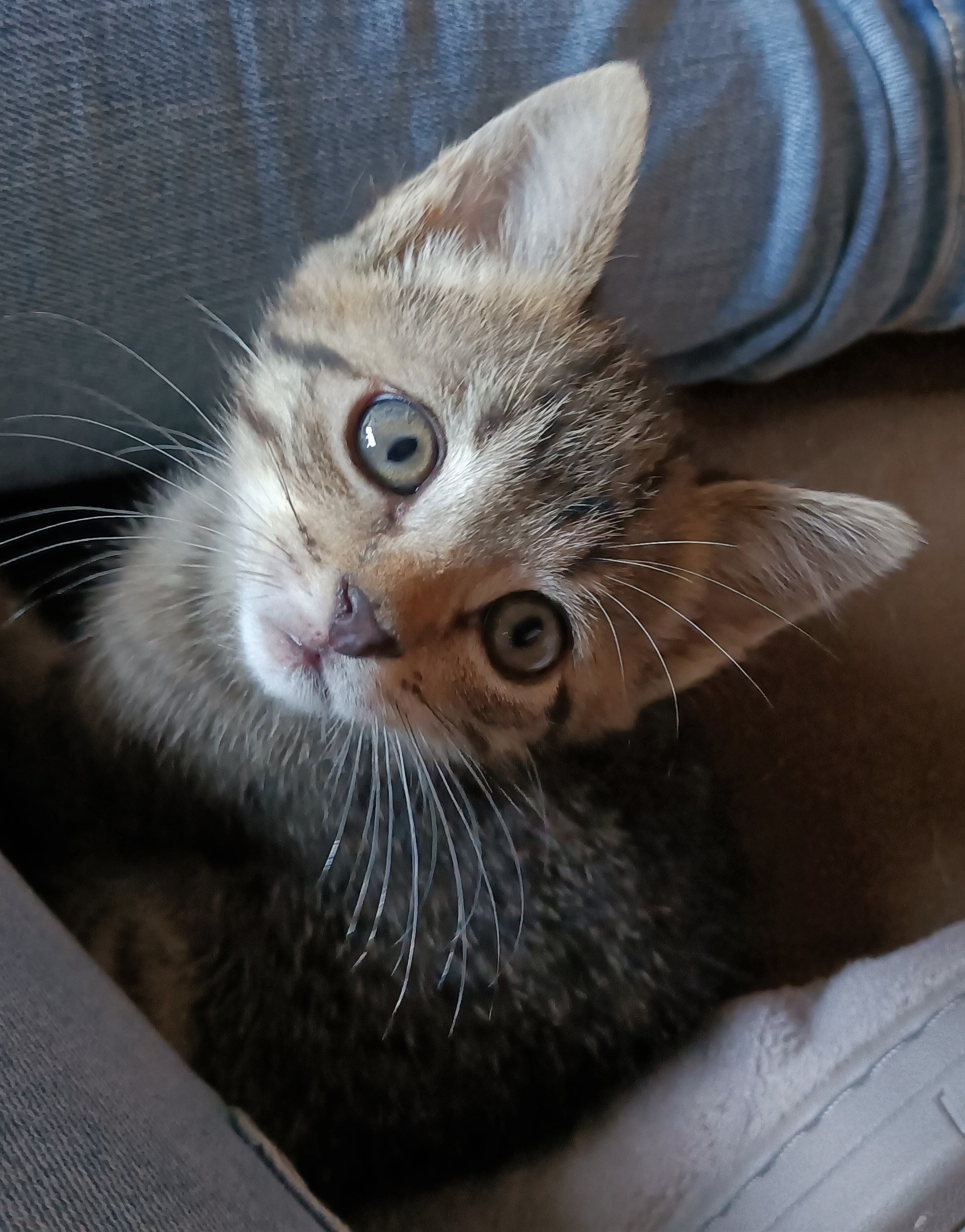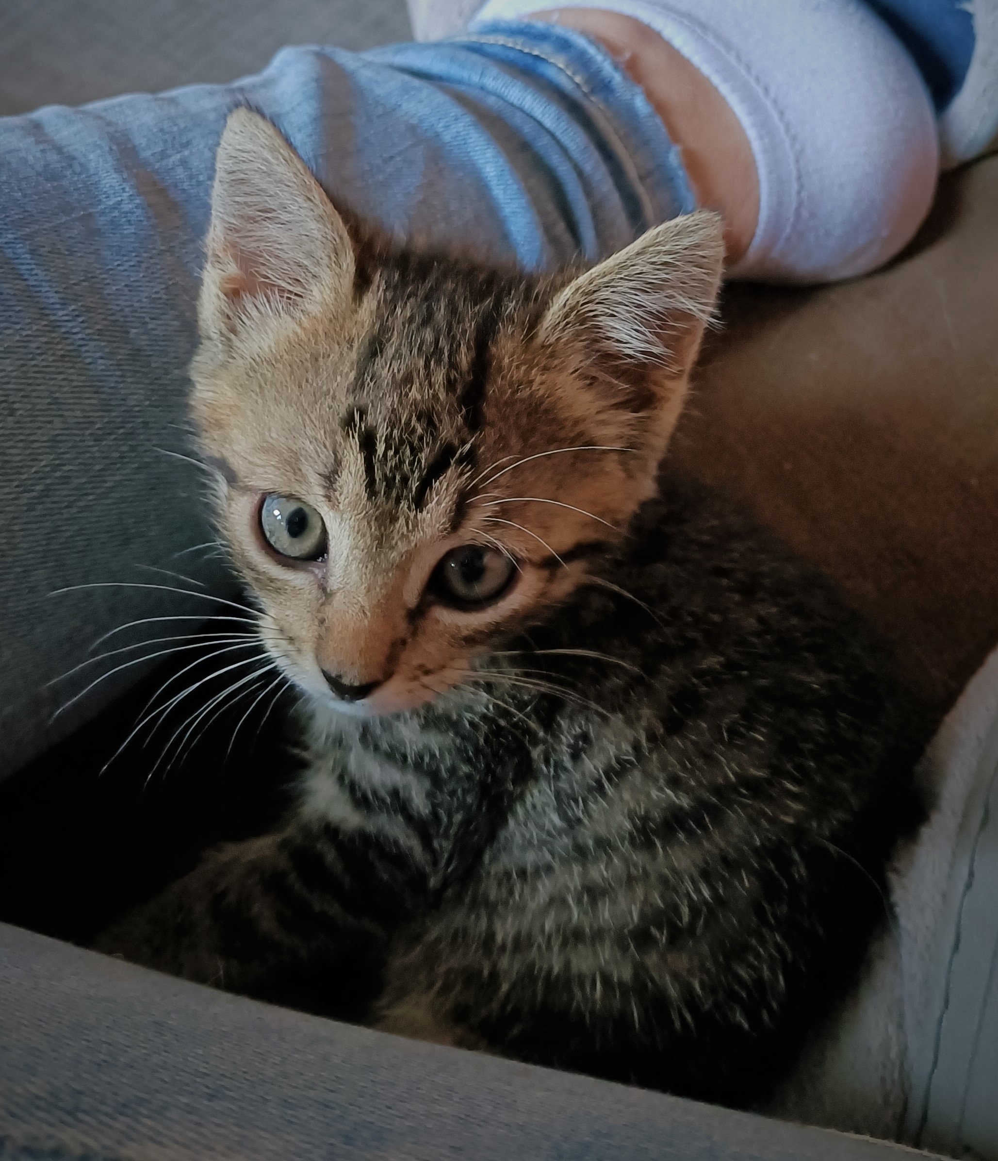 pertenece a la camada Haliwell. Estas tres hermanitas fueron encontradas tiradas en un contenedor de basura. No hay ser más despreciable que el que hace eso con unos bebes indefensos. Por fortuna, alguien que pasaba por alli dio aviso y fueron recogidas. A día de hoy las tres crecen juntas en su casa de acogida y son un amor. Las tres son muy cariñosas y se llevan bien con perros y niños.
