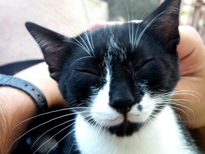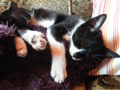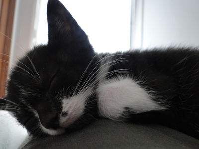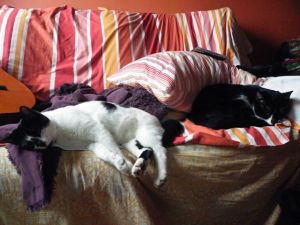 «Es el más mimoso de los tres. Siempre quiere estar encima de alguien y nada más tocarlo empieza a ronronear (hasta soñando ronronea!). Es un comilón pero es el que más delgaducho está (no sé cuando lo quemara todo porque se pasa el día dormidito). Juega mucho con los otros dos pero también le encantan las pelotitas de papel de aluminio, y da unos saltos enormes hacia arriba cuando juega con ellas. Es negrito con las patitas y la tripa blancas».