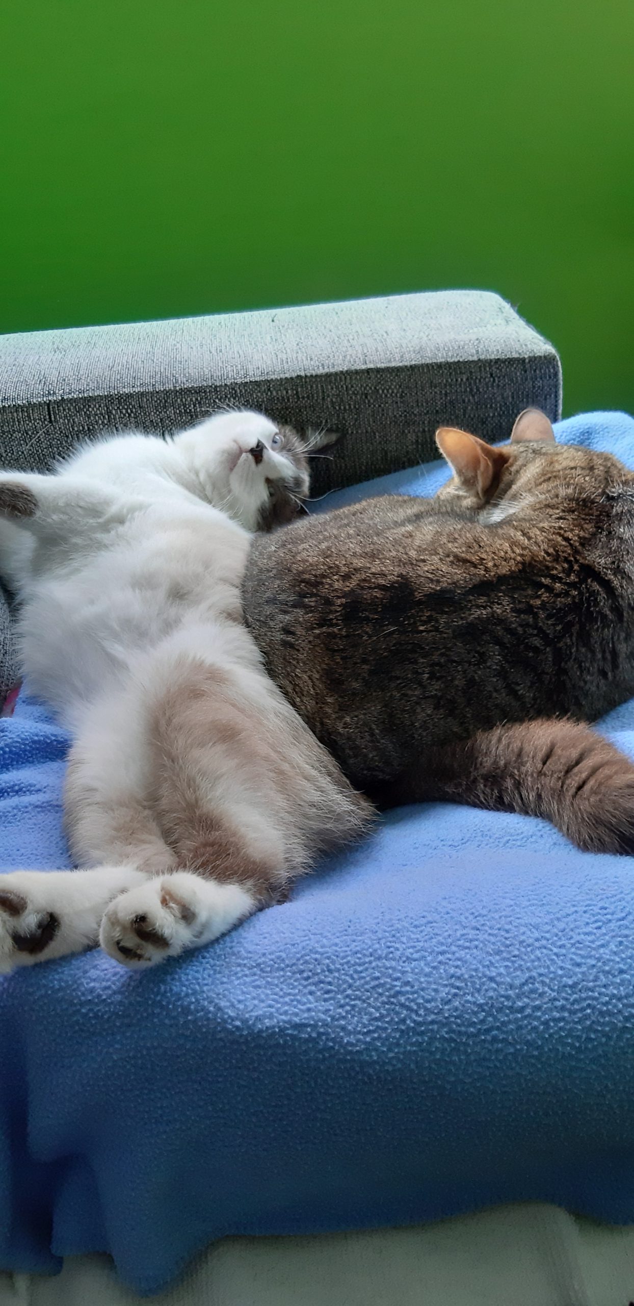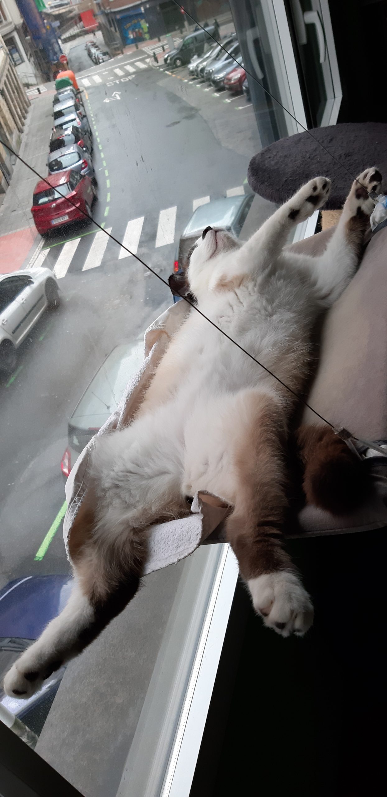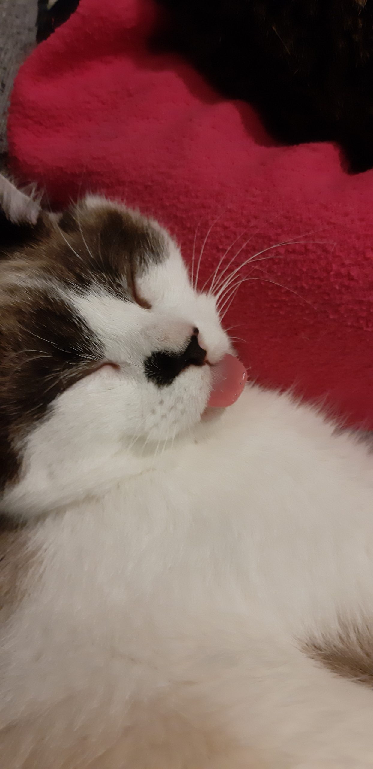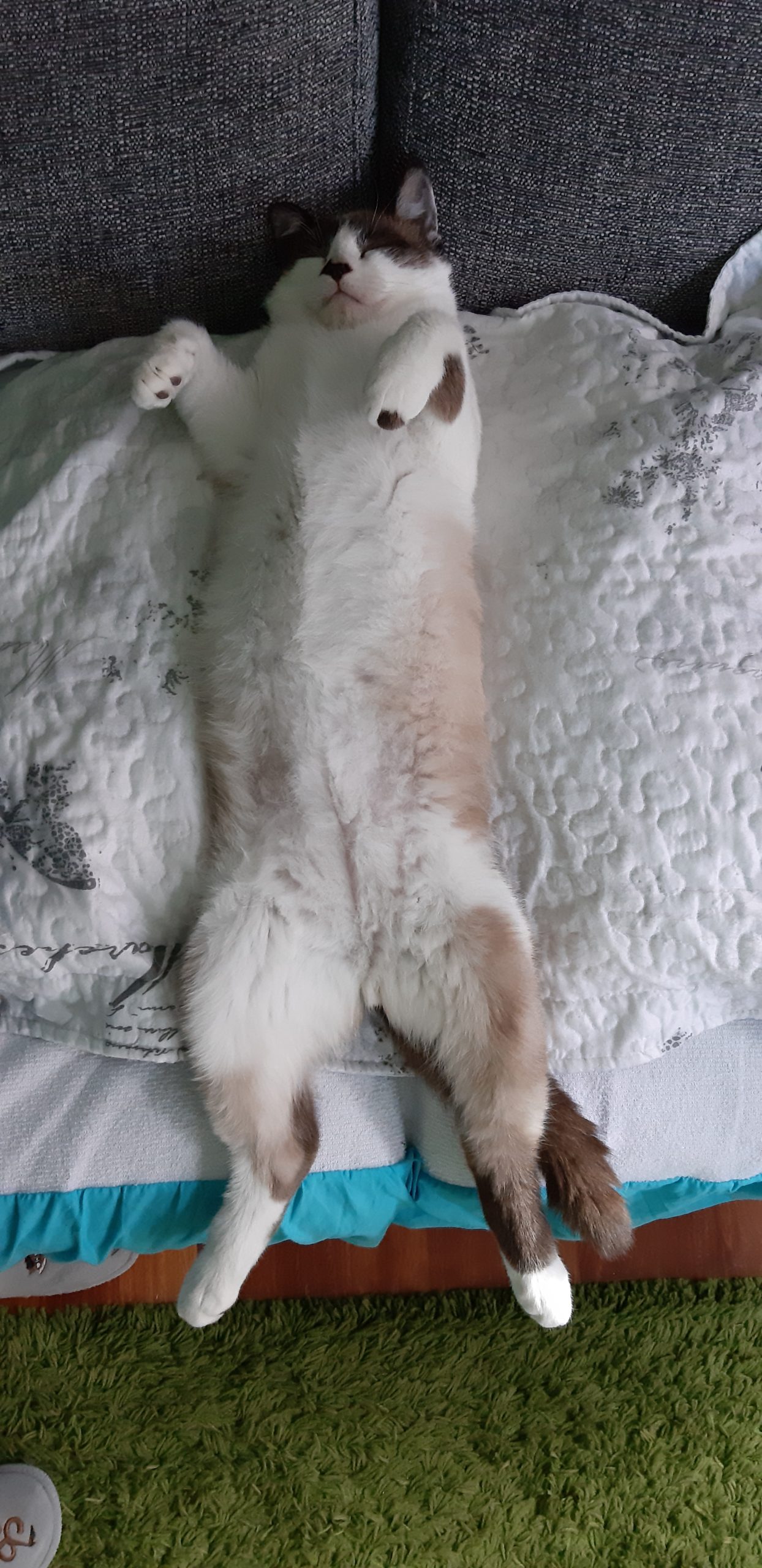 Te mando unas fotos del gordo. Sigue igual de cariñoso y juguetón, ahora ya se lleva mejor con mis gatos, algunas veces juegan juntos aunque hay veces que el juego acaba en una pelea sin consecuencias, ya que Pekas, para lo joven que es, tiene un carácter dominante. Menos mal que Montxito ya le ha puesto en su sitio.  Con nosotros es súper cariñoso, le podemos coger en brazos y él encantado ronronea a todo motor. Come como una lima, todo le viene bien. Y es muy gracioso verle dormir, porque se tumba en posturas imposibles.