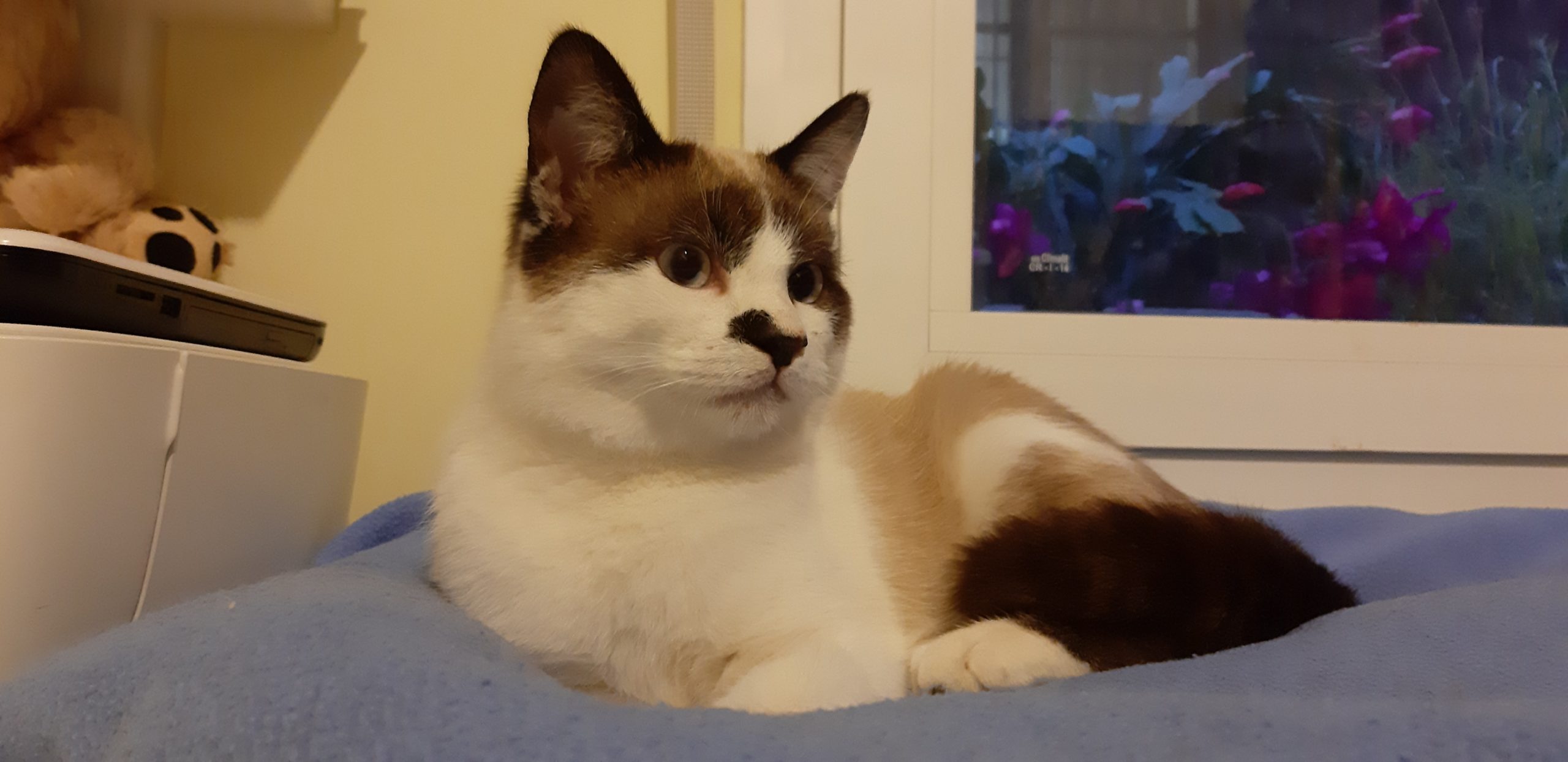 Es un gato precioso, con un pelo «esponjoso» y muy grande de tamaño para su edad, tiene unas patazas…