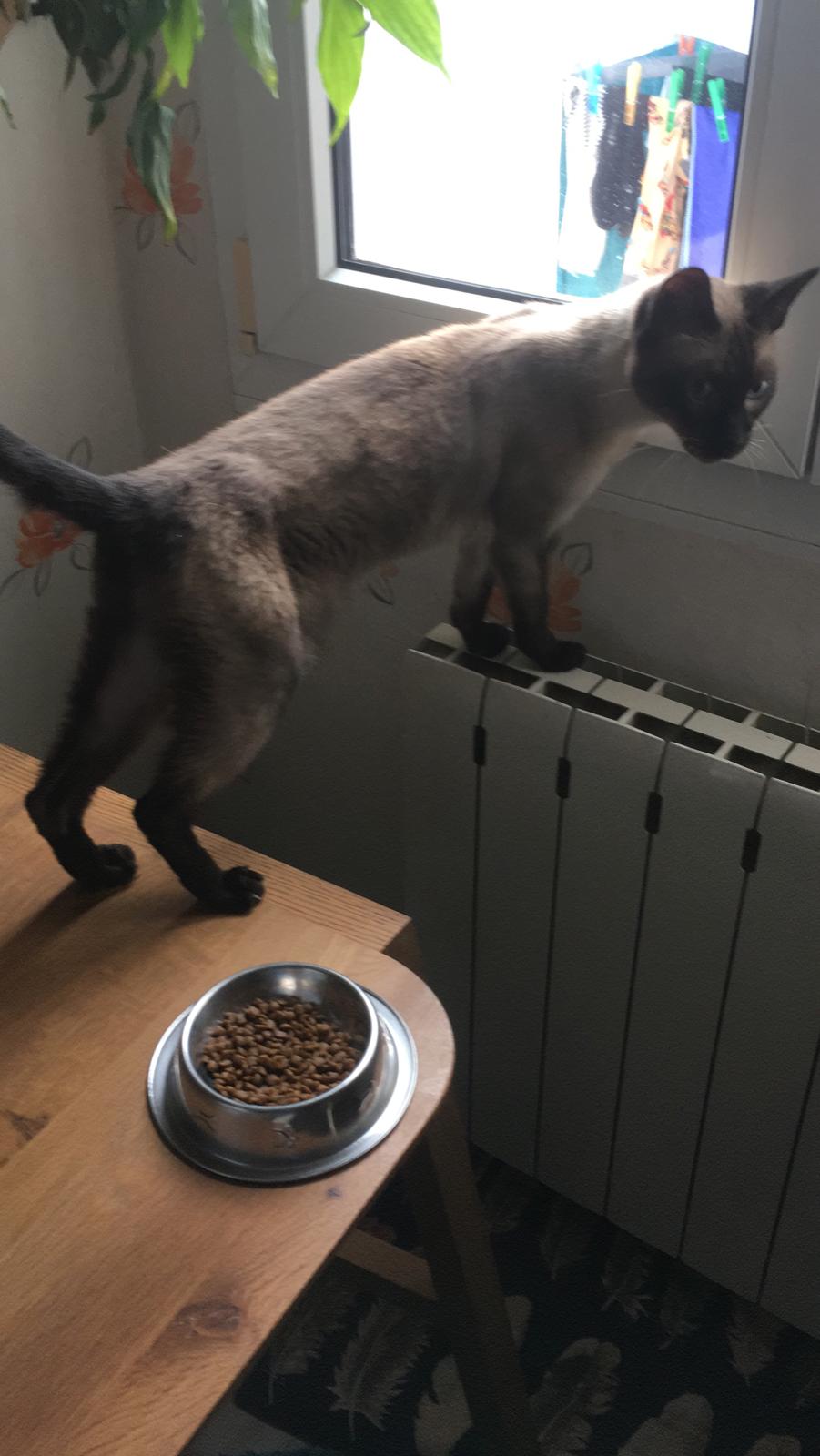 Lo más importante es que está comiendo. no es un devorador nato, lo que le gusta es tener comida a disposición e ir picoteando de vez en cuando, pero al final se come una ración amplia al día y no ha vomitado una sola vez desde que vino a casa el miércoles pasado, así que estamos contentos. También come lata, pero no le entusiasma, prefiere el pienso kitten. La malta sí que le vuelve loco.