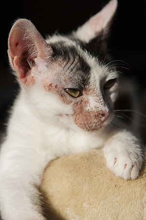 El pobre Rebeco, no tiene suerte… después de pasarlo mal cuando fue encontrado, le añadimos a que tiene problemas en la piel… ha dado positivo a hongos pero creemos que hay algo más con ello, quizás alergia…
