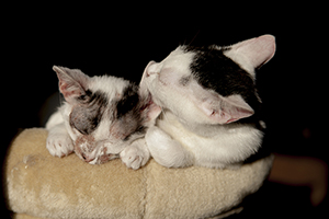 Rebeco en estos días se ha ido haciendo poco a poco, ya no se asusta, esta integrado con los demás, aunque prefiere dormir el solo, juega, ya no bufa, ahora ya es una bolita encantadora. Es muy suyo con la comida, si se le acerca otro gato mientras esta con su comida, pone la pata y gruñe, así esta él…