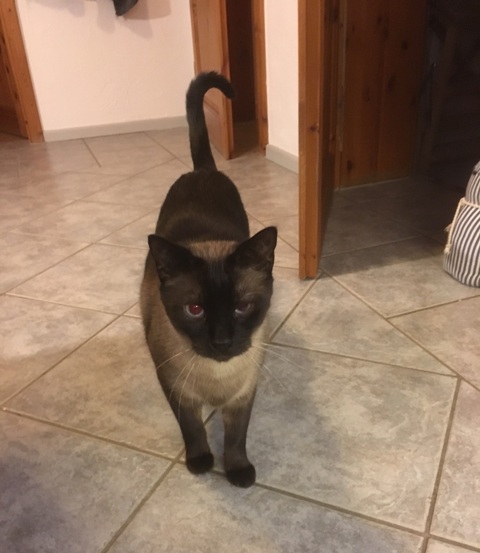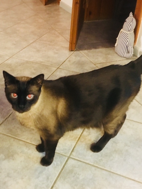 Riki es un siamés precioso, tendrá unos 3 meses aproximadamente, está asustado, así que de entrada bufa un poco, pero luego se deja acariciar y se frota.
