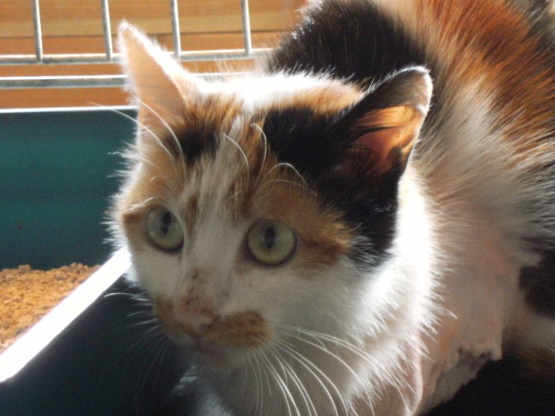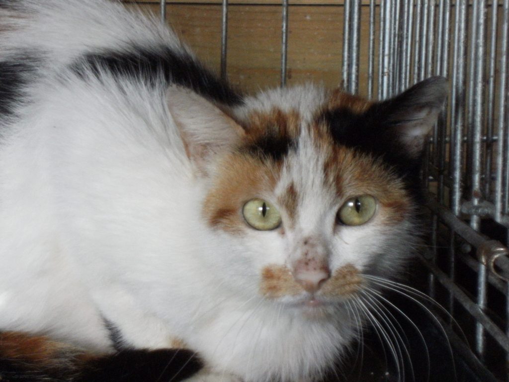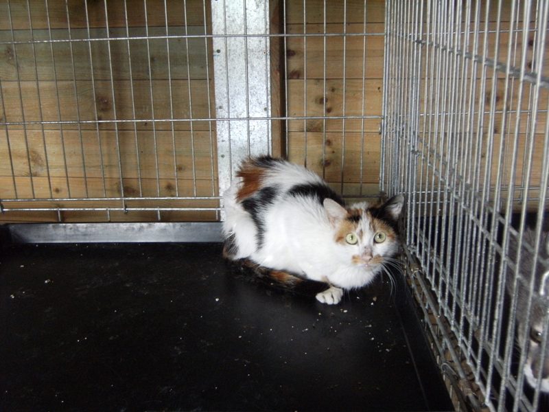 SAVAGE es esta gata tricolor tan asustada, es algo salvajilla de momento, de ahí su nombre.