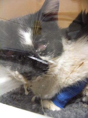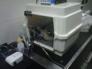 Debido al estres, la depresión y la anorexia le bajaron las defensas y le afectaron todos los virus que podian en ese momento. Aun estando acogida y atendida, finalmente hubo que ingresarla ya que se ahogaba, no comía nada de nada, los ojos le empeoraron un montón…ha estado muchos dias con tratamiento a base de nebulizaciones de medicamentos en una urna indicada para ello.