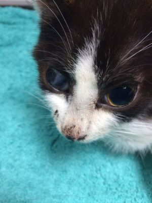 Tiene un ojo perdido creemos que por haber pasado alguna herpesvirosis sin tratar en condiciones, respira mal porque tiene un pulmón bastante tocado…pero es que además ha llegado con síntomas de un problema neurológico; nistagmo, desorientación y lo peor de todo…parece que por el ojito sano no ve absolutamente nada