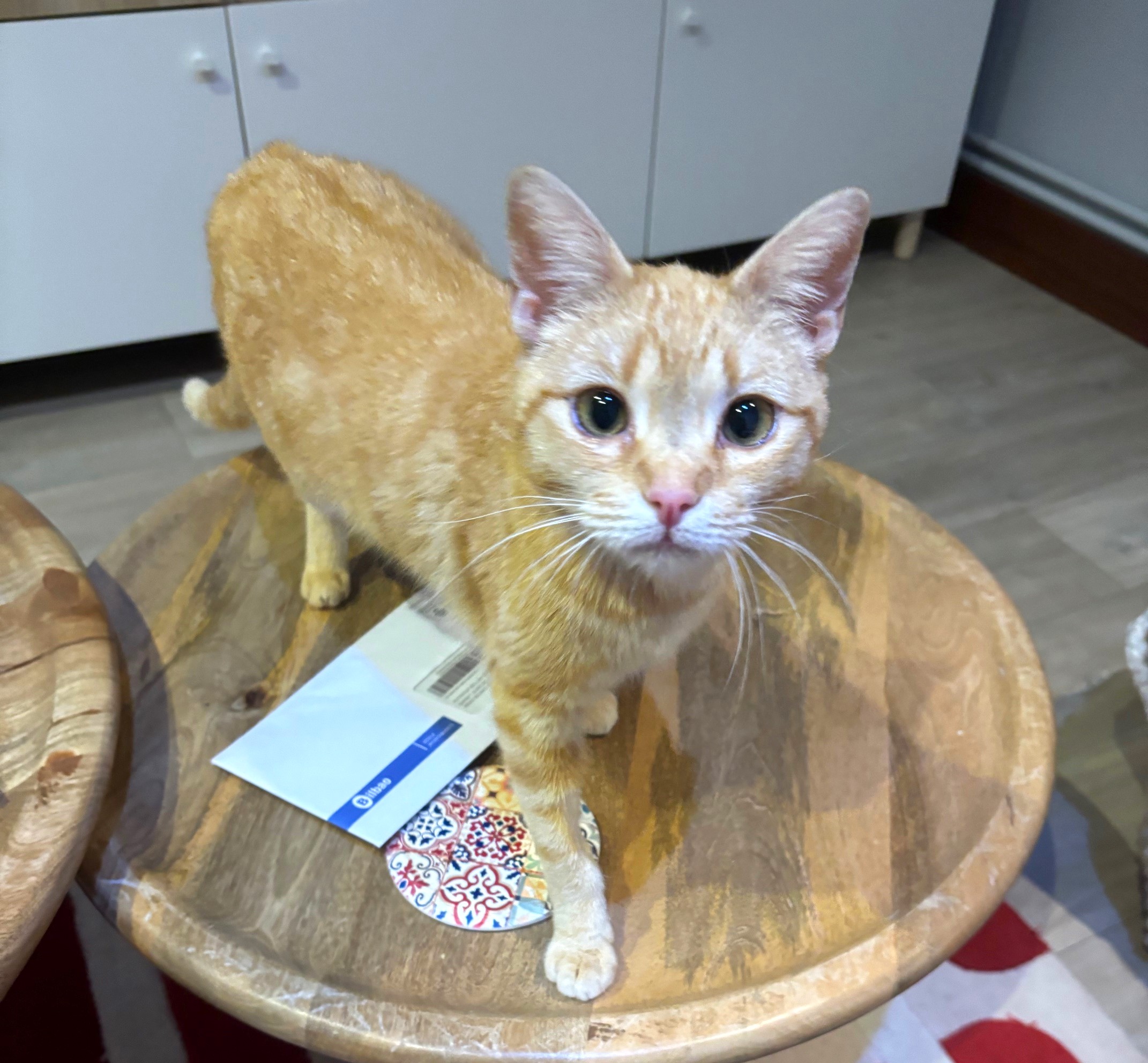 Es cariñosa, se deja coger en brazos sin problemas pero se aburre porque quiere descubrir más sitios. Tiene pinta de que es una listilla roba-comida, porque la única vez que ha maullado ha sido al verme con algo en la mano y ha tirado la pata a ver si lo cogía.