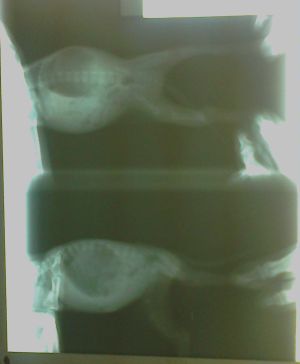 Esta mañana ha estado en el vete y le han hecho radiografias (os ponemos abajo)…casi no se pueden ver sus huesecitos porque todavía están calcificandose, colocandose…no parece que tenga nada roo, pero posiblemente sí luxado.