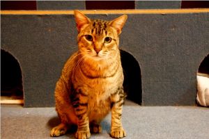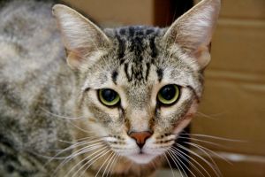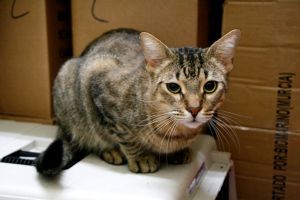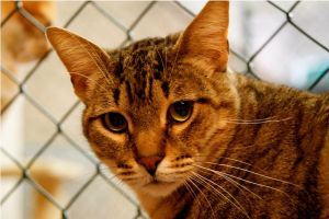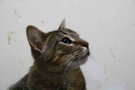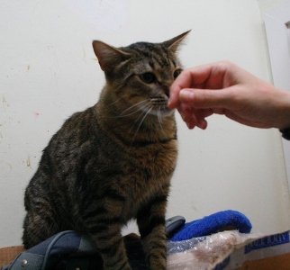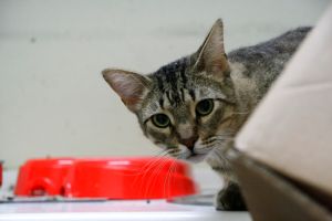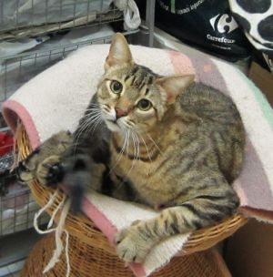 Llegó muy asustado y al principio se escondía y ni se dejaba ver. Ahora ya está más relajado y aunque se asusta un poco cuando le vas a tocar, se deja.