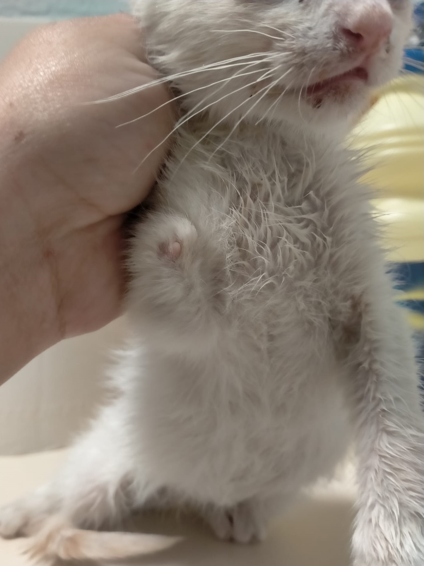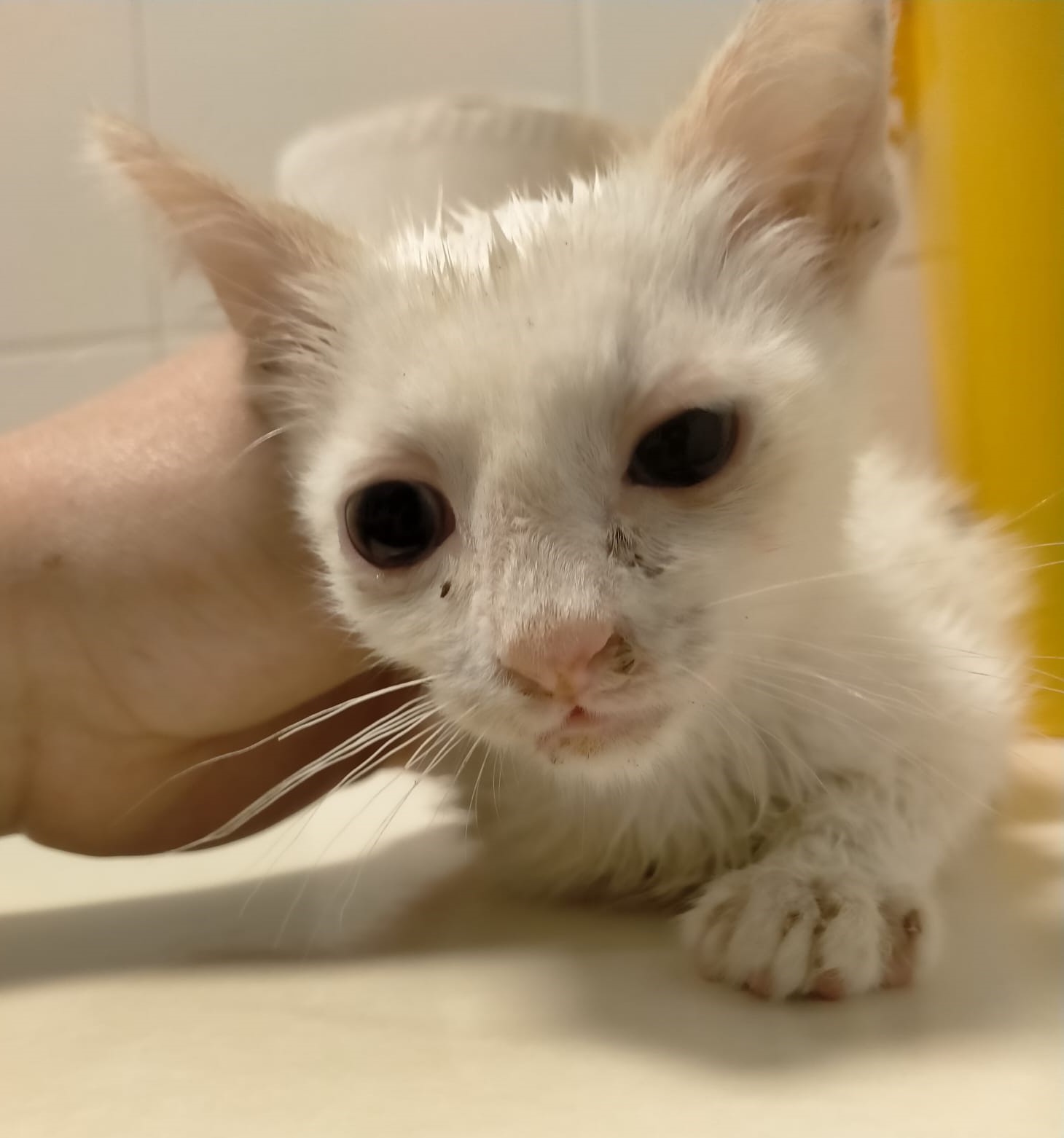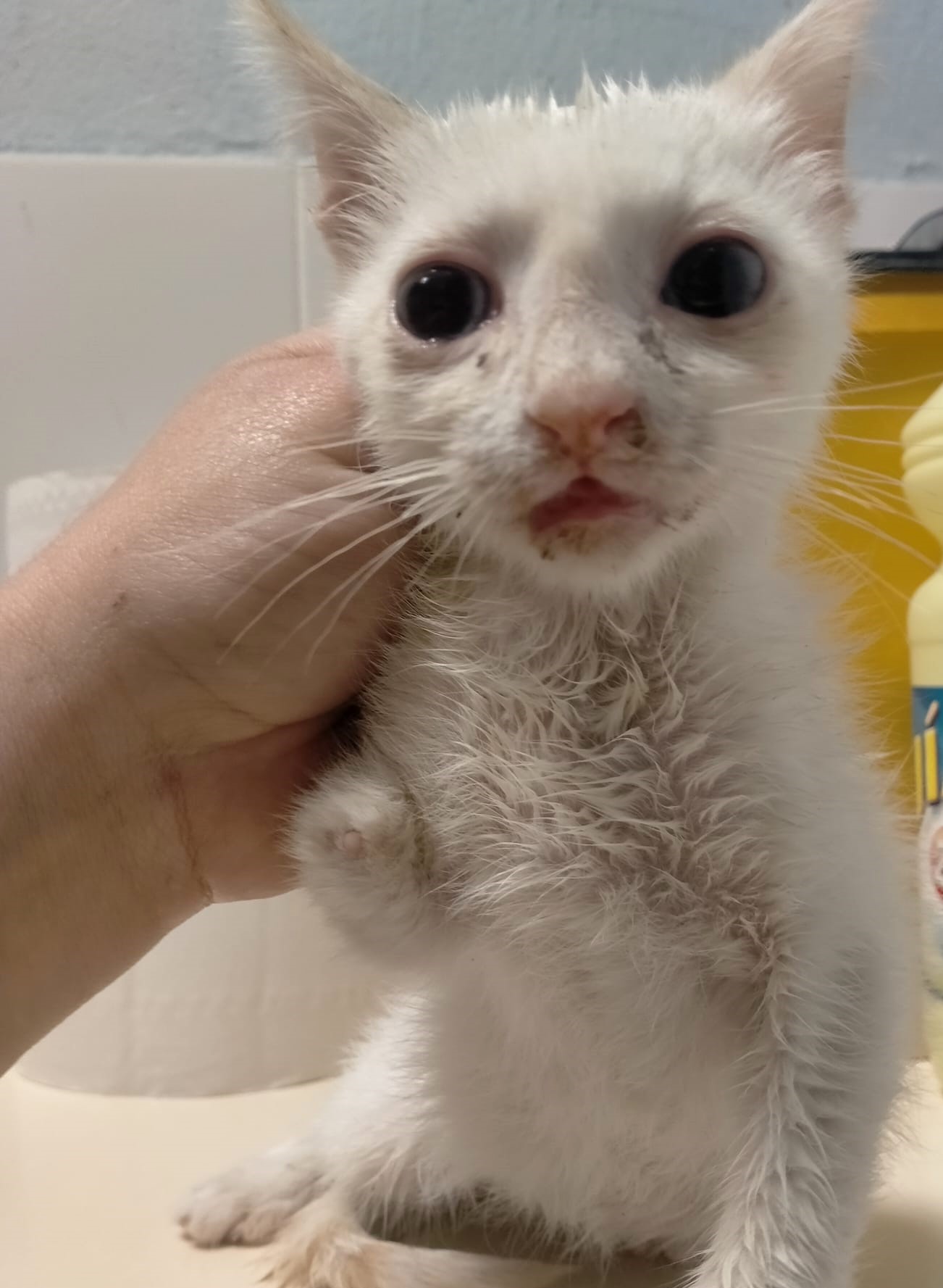 Aunque llegó muy asustado es mas majo que las pesetas y se queda ronroneando mientras se le acaricia. Está en tratamiento para el cuadro respiratorio.