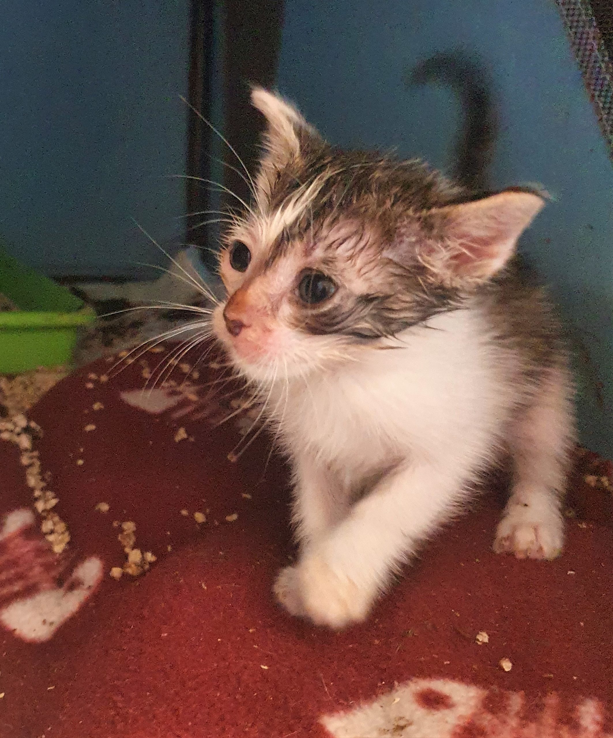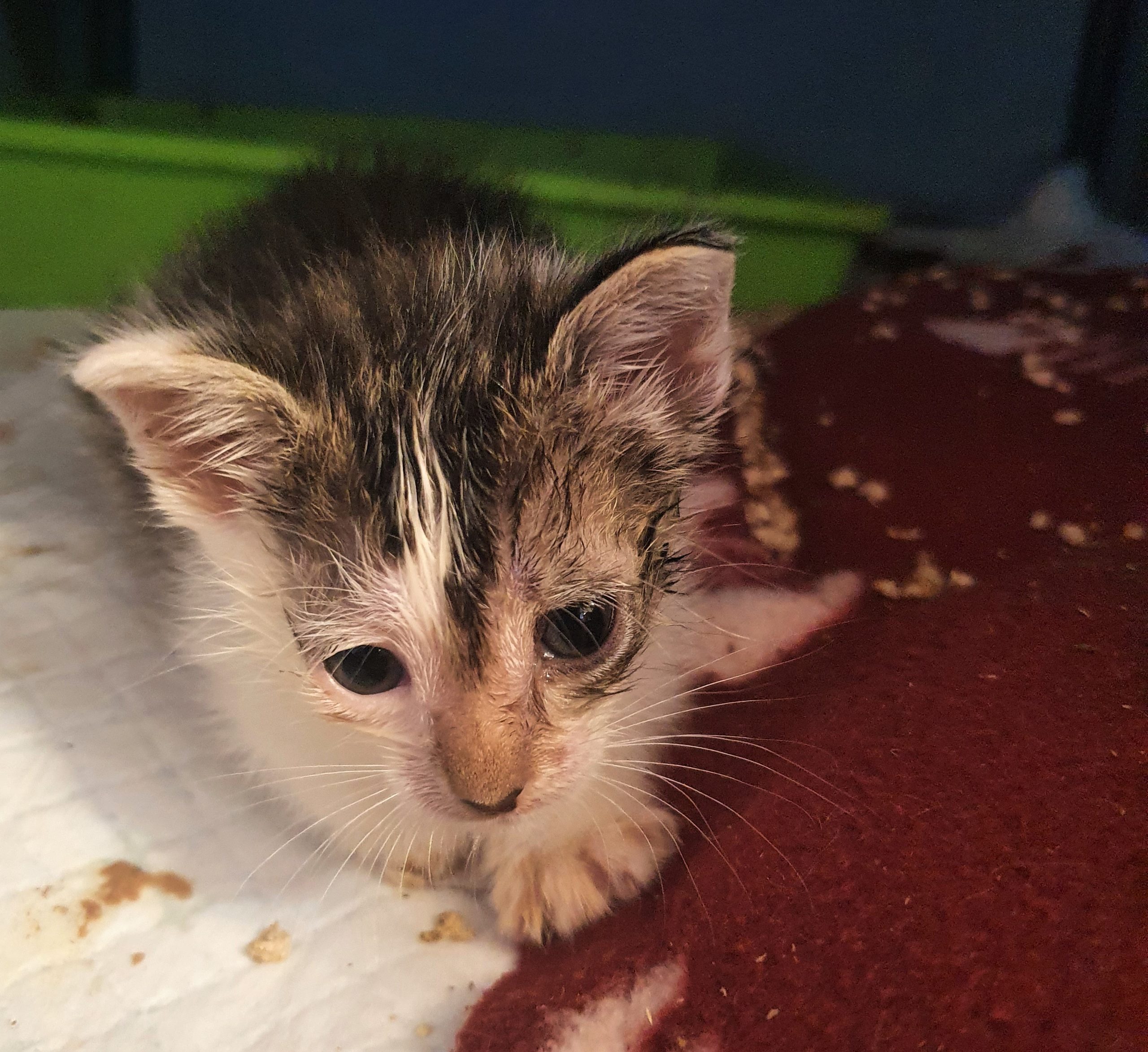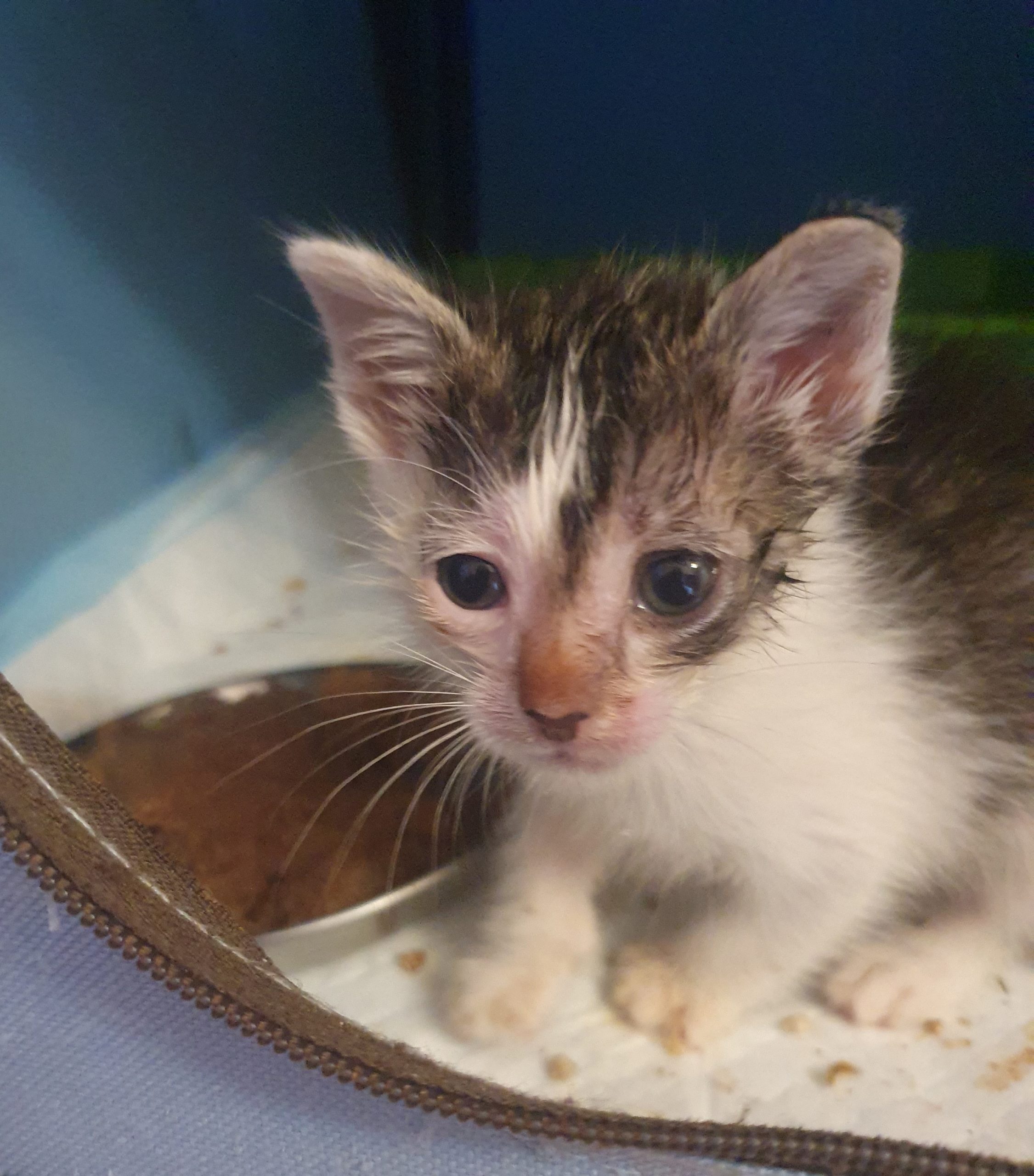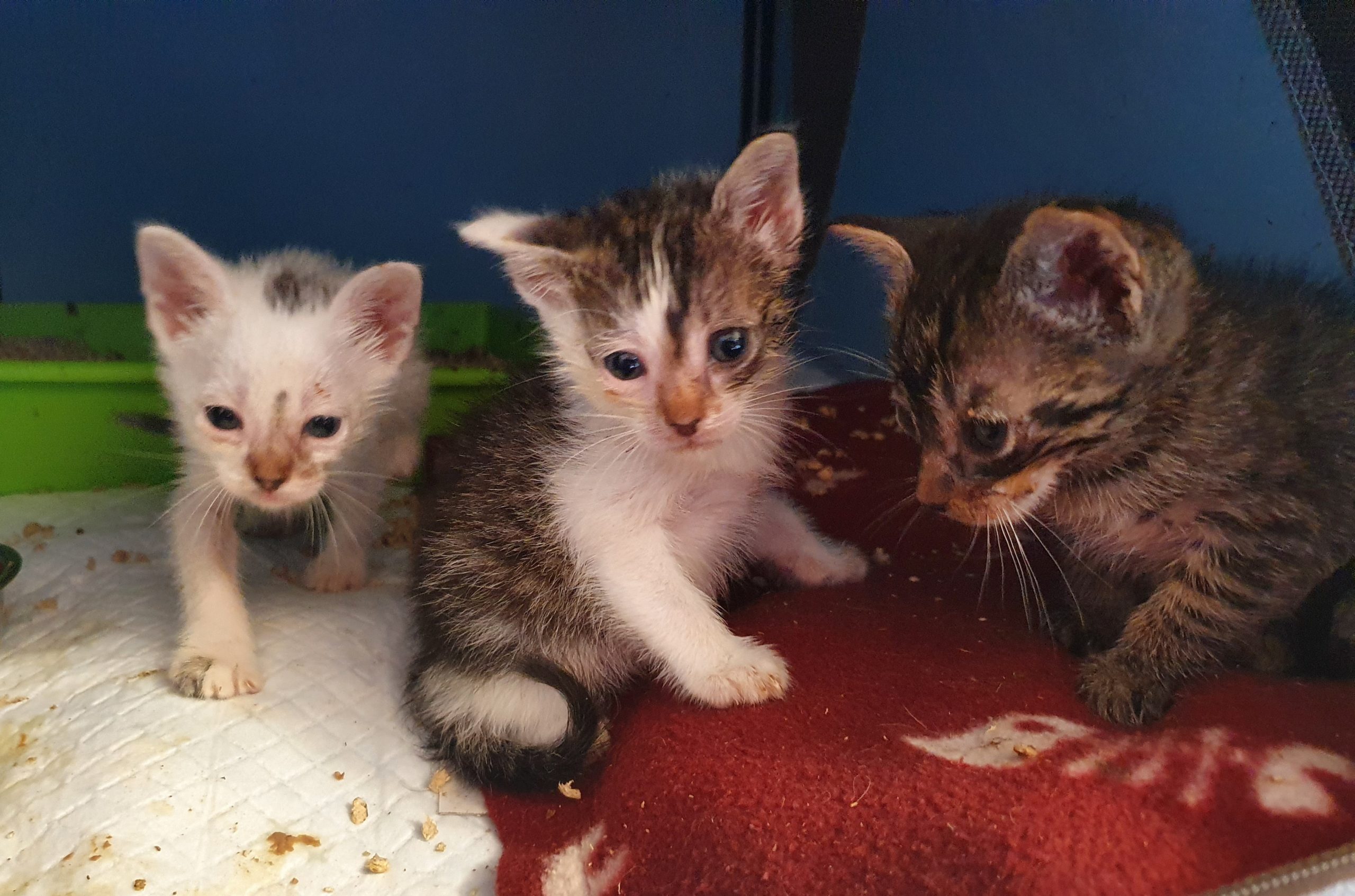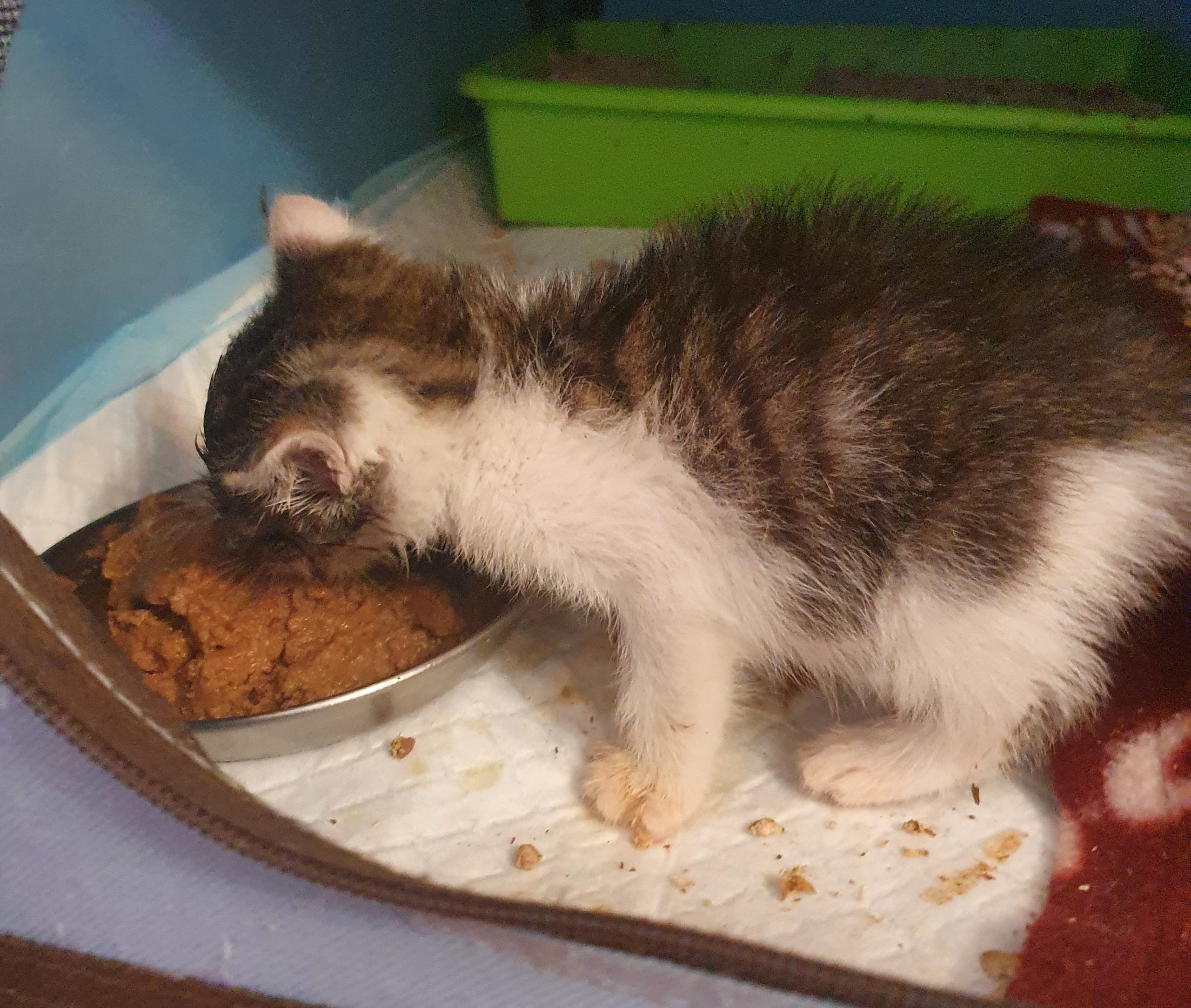 Les calculamos que tienen unos 25 días. Llegaron muy delgados, con pulgas y con los ojitos mal. Aun no comen solos del todo, pero ya empiezan a lanzarse a por la comida húmeda. Las comidas las hacen bajo supervision para asegurarnos de que comen en condiciones. Ya han recibido la primera desparasitación y están en tratamiento para los ojos que ya han mejorado muchísimo de cómo llegaron.