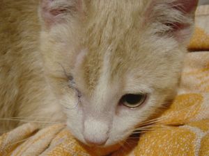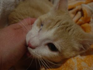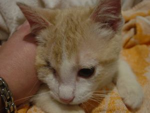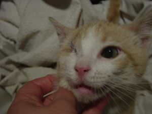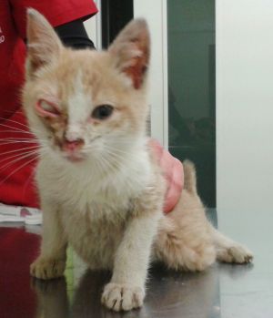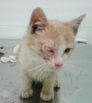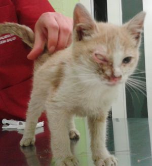 Es un machito de unos tres mesecitos, con solo 780 gramos de peso y el ojo… perdido, habrá que quitárselo porque lo tiene mal, pero el pobre ha llegado también con cuadro respiratorio, fiebre…