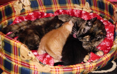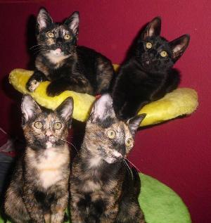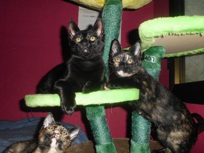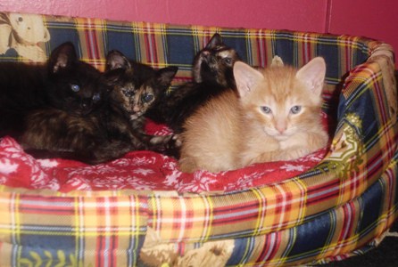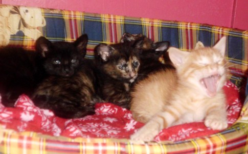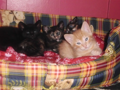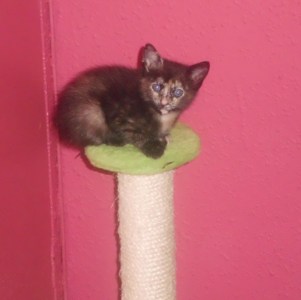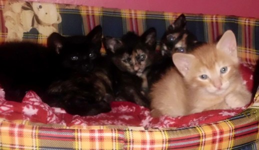 «Los 5 estan preciosos empezando a comer latita, pienso y pechuga de pavo. Por ahora no usan el arenero pero es que son enanísimos ahora mismo tienen un mes y 10 días. Corretean y dan saltitos, usan el rascador, ahh y ya beben agua ¡¡me escalan continuamente!!»