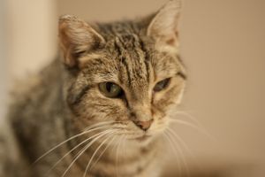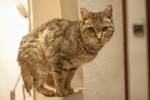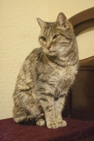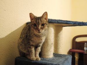 Tiene un buen carácter para vivir con otros gatos: aunque no interactúa con ellos ve con total normalidad que haya otros a su alrededor y ni intimida ni se siente intimidada. A la hora de comer, los demás la respetan. Tenemos pendiente hacerle una analítica para controlar los parámetros renales ya que, por su edad, no sería extraño un cierto grado de insuficiencia renal que podría empezar a tratarse antes de que pudieran aparecer síntomas.