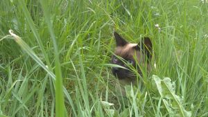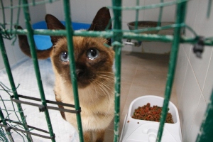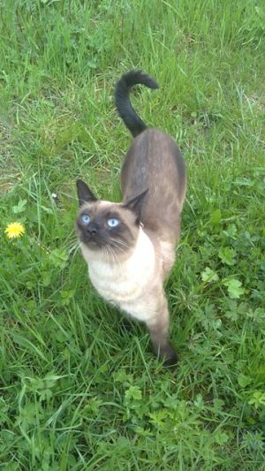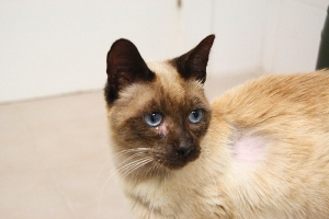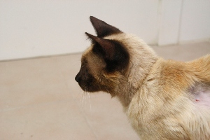 Tolomeo es un macho adulto muy cariñoso.  La calva más grande no se ve, y la tiene en el costado derecho, aparentemente por lamido excesivo. Llegó con una de las patas delanteras inflamadísima, daba miedo. También tenía infección respiratoria. Ahora ya está bien y está listo para ser adoptado.