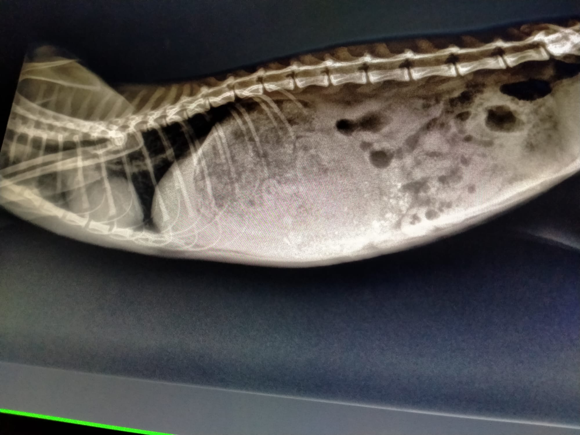 Trixie Fue la primera que sacamos, la ingresamos e urgencia el Domingo porque vimos que algo no iba bien con ella. Ya se ve en la radiografía que hasta piedrecitas tiene 🙁 . Eso si, habia comido un montón 😀 . Uno de los oídos la supuraba un montón de pus que casi seguro es lo que le hacia estar tan decaída. Además se vieron un montón de ácaros que no facilitaban las cosas. También esta con conjuntivitis .La veterinaria cree que llega al año de edad .