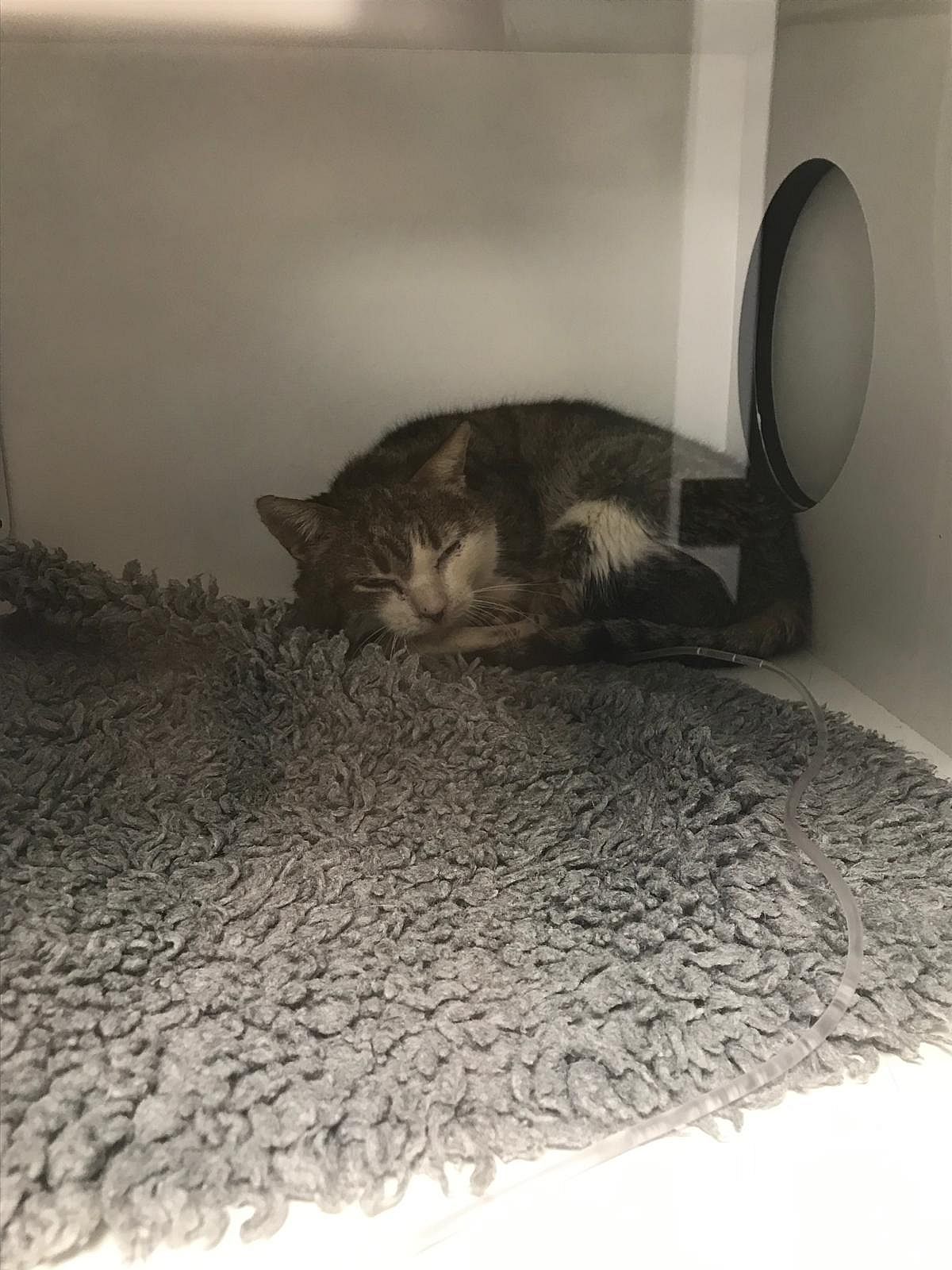 Velez mejoro y pudo salir de nuevo a los recintos exteriores de la perrera con el resto de compañeros positivos como el. Este pasado sábado le vimos con muchísimos mocos, mas delgado y bastante apático así que le trasladamos a clinica donde quedo ingresado. Las radiografías mostraban un patrón bronquial muy marcado, los mocos eran abundantes, ademas la analitica daba infección, anemia, y principio de un problema renal. Tambien estaba deshidratado ¡¡Nuestro abuelito gruñón lo tiene todo!! Ahora mismo esta con suero, antibióticos y calor pero en breve tendrá el alta.