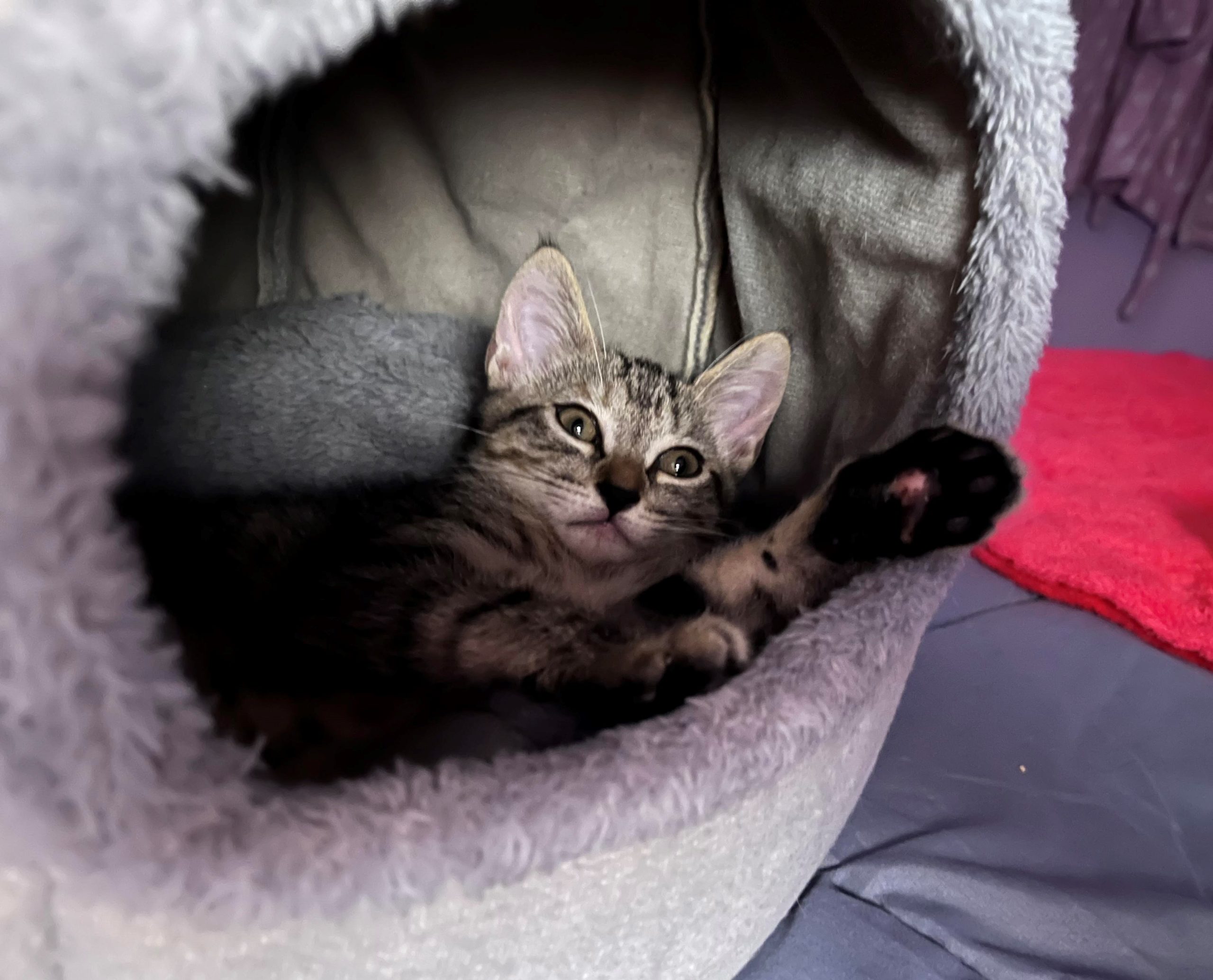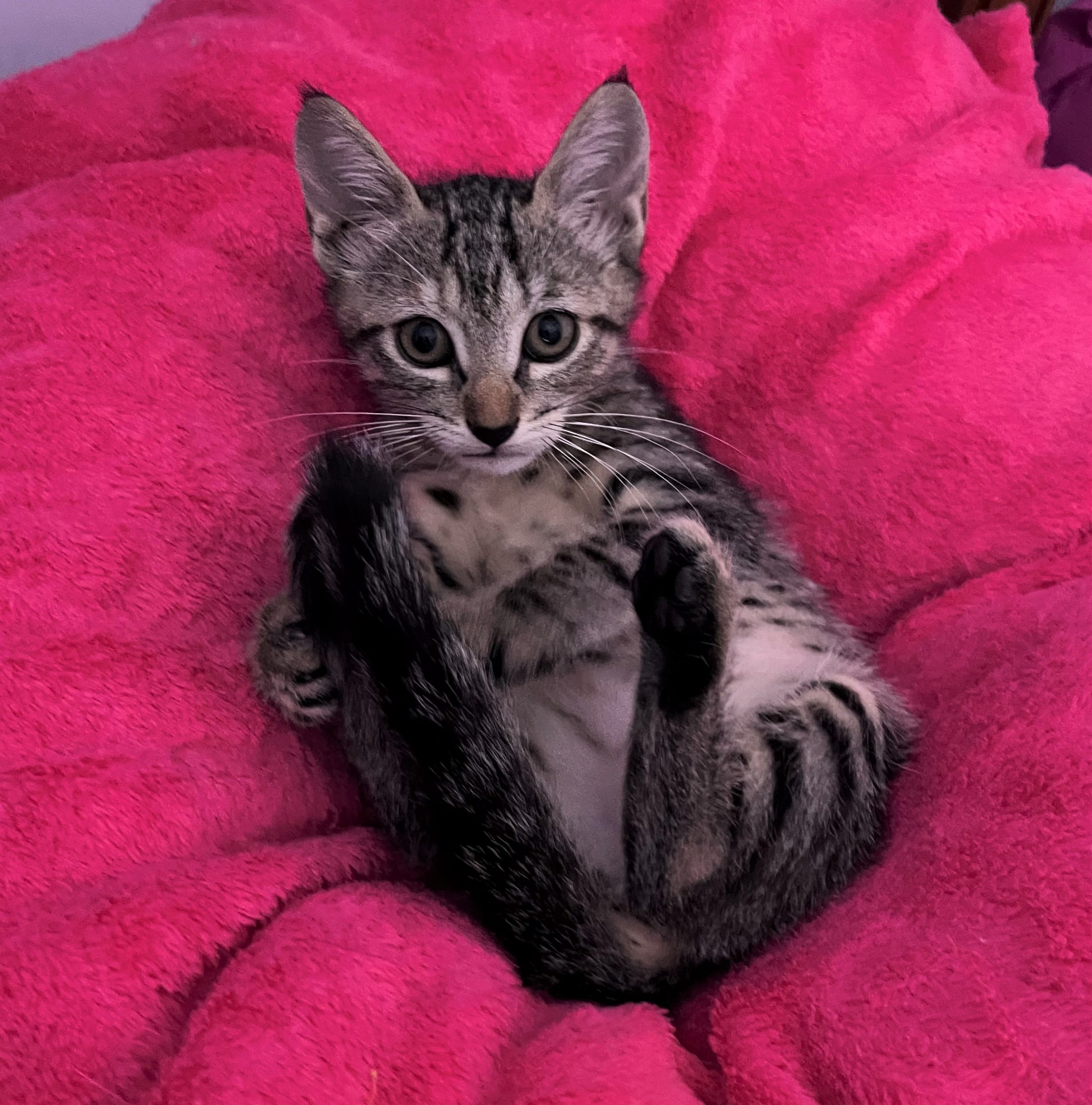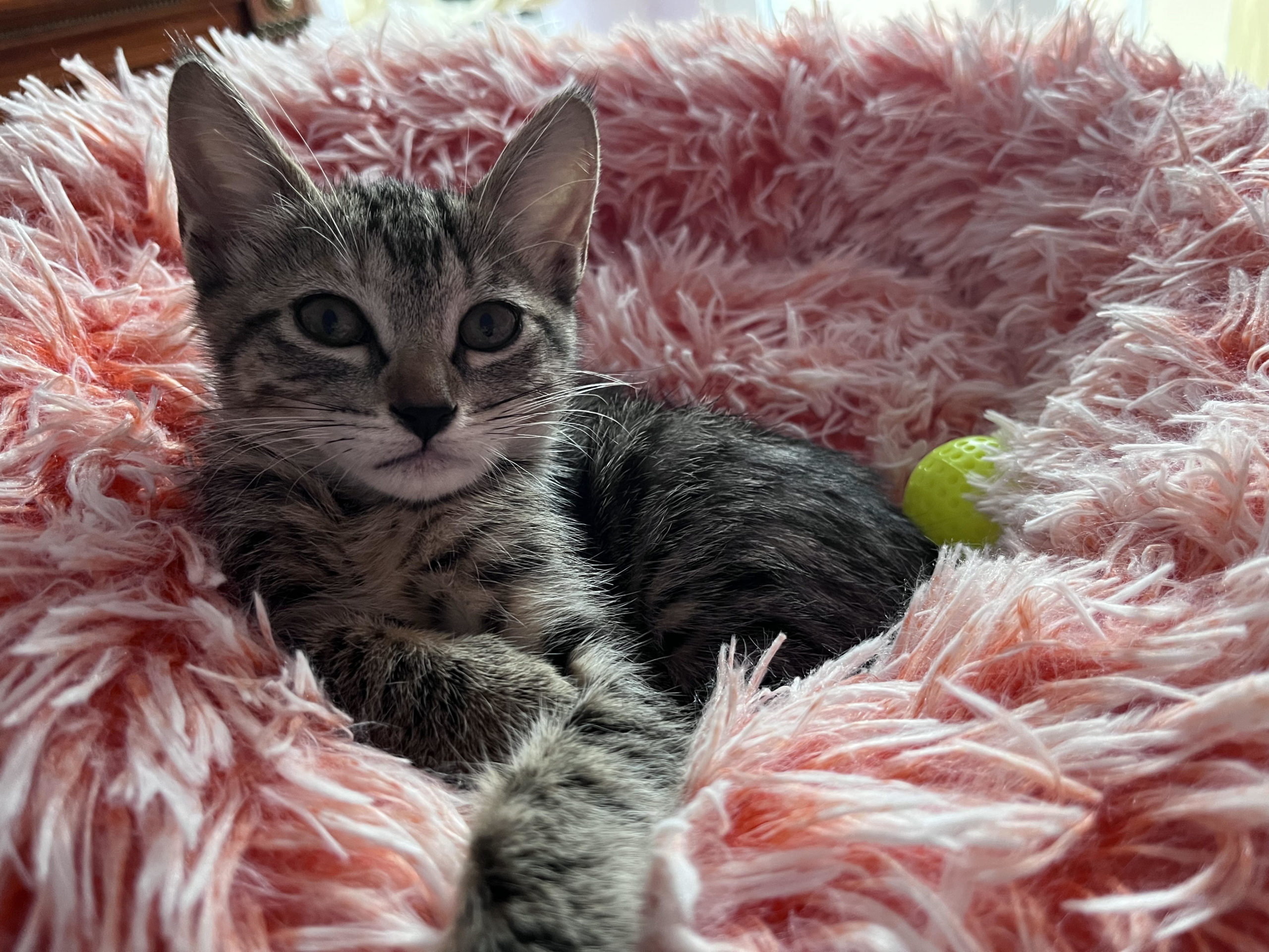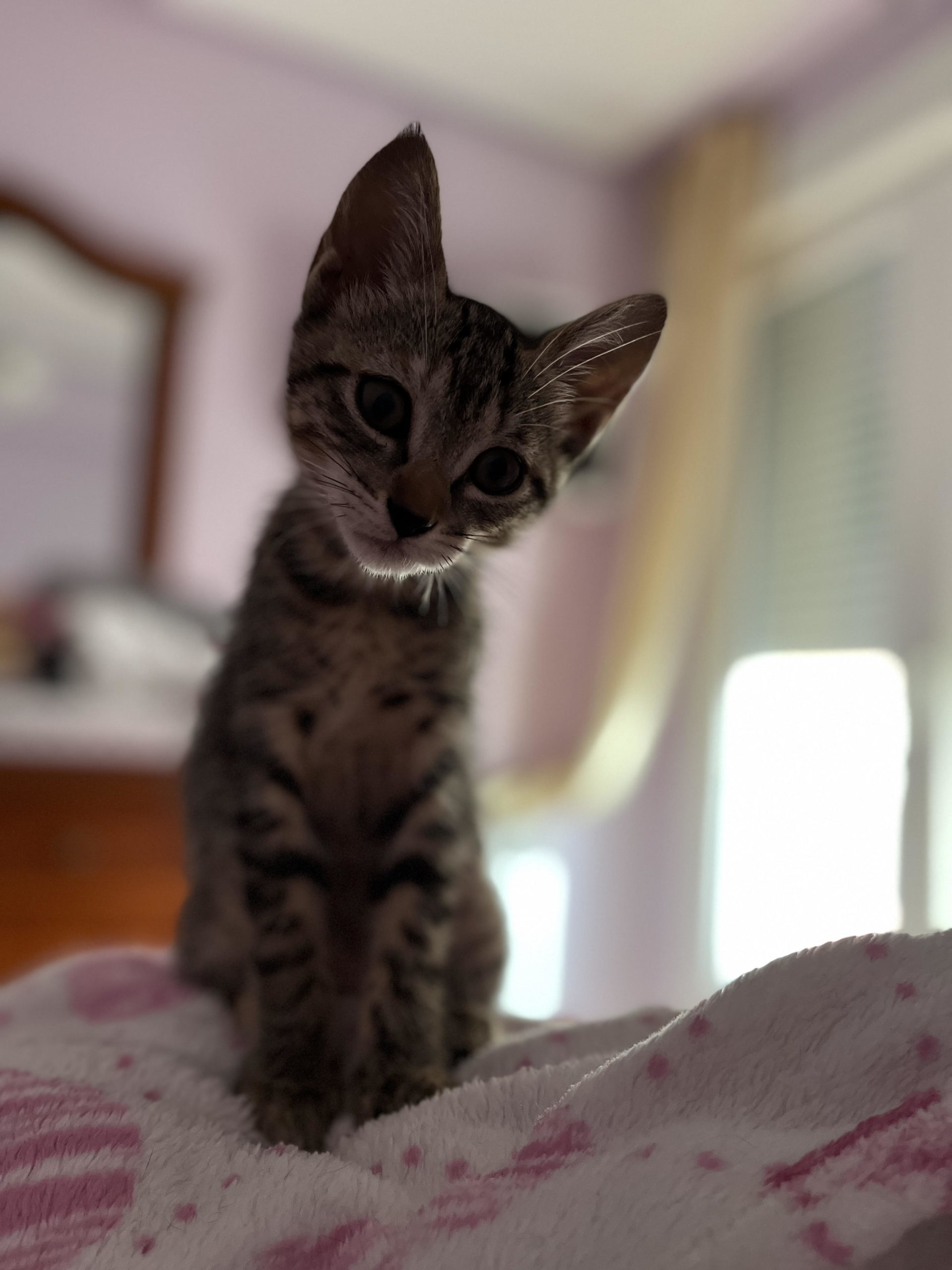 ¡Hola! soy Vilma y tengo 2 meses y medio. Soy una gatita muy cariñosa y buena. Me dejo coger aúpas y me encanta jugar con pelotitas y todo lo que pillo como buen cachorro que soy. Me gusta jugar con otros gatos e interactuar con ellos pero sobre todo me gusta que me den mimos. Tambien me gustan mucho unas latitas super ricas que me dan y una cosa que llaman pechuga de pavo. Estoy buscando casa de acogida y adopción en una familia que me quiera para toda la vida.