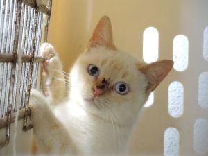 Es un gatito tímidín que poco a poco empieza a dar pasitos con los humanos, maúlla mucho, le gusta jugar manteniendo sus distancias, con cañas, bolitas, etc… no sabemos lo que habrá pasado el pobrecito en su corta vida para esta desconfianza, pero se le ven las ganas de recibir mimos… en otros casos parecidos en cuanto se dan cuenta de que todo va a ir bien, luego es rápido y se convierten en osos amorosos.