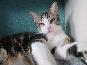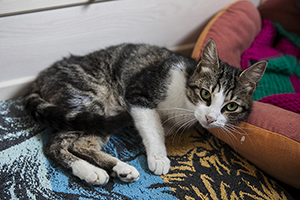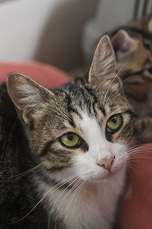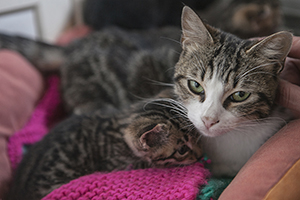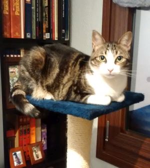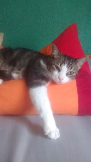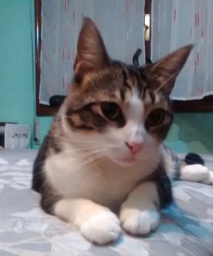 Tras criar a sus pequeñines, ha estado viviendo feliz en su casa de acogida…además de ser una gata guapísima; es cariñosa, habladora…