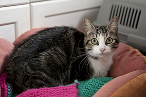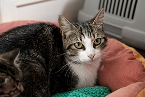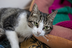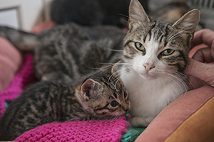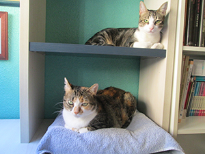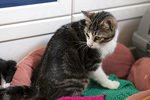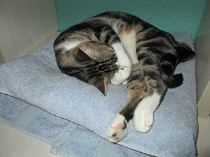 Se lleva muy bien con el resto de gatas de su acogida…es muy sociable con ellas pero a veces cuando la están acariciando o dando chuches y aparece otra de las gatas, ella siempre se retira y se queda aparte. No es preocupente porque ella misma las llama y las busca para jugar, para dormir, para todo, pero a la hora de caricias o comida, siempre se retira.