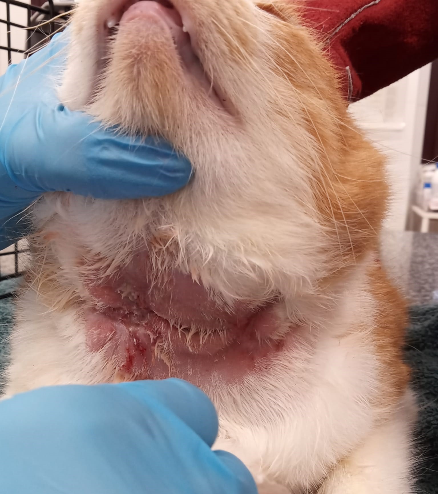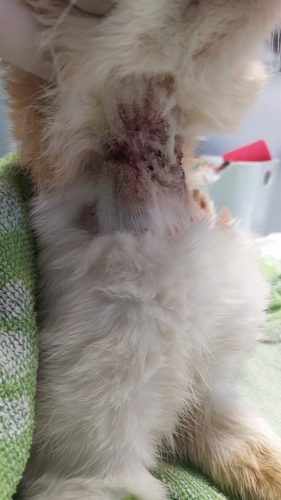 YAHIKO estaba en la calle en una «colonia» de un restaurante. Llevaba tiempo con esa herida sin atender y fue llevado al veterinario donde además de desparasitarlo (estaba plagado de garrapatas y pulgas), realizar las curas pertinentes y darle tratamiento antibiótico, también se le aplicó láser para mejorar la cicatrizacion de la herida. Aún así la herida no termina de curar y además el isabelino no ayuda.